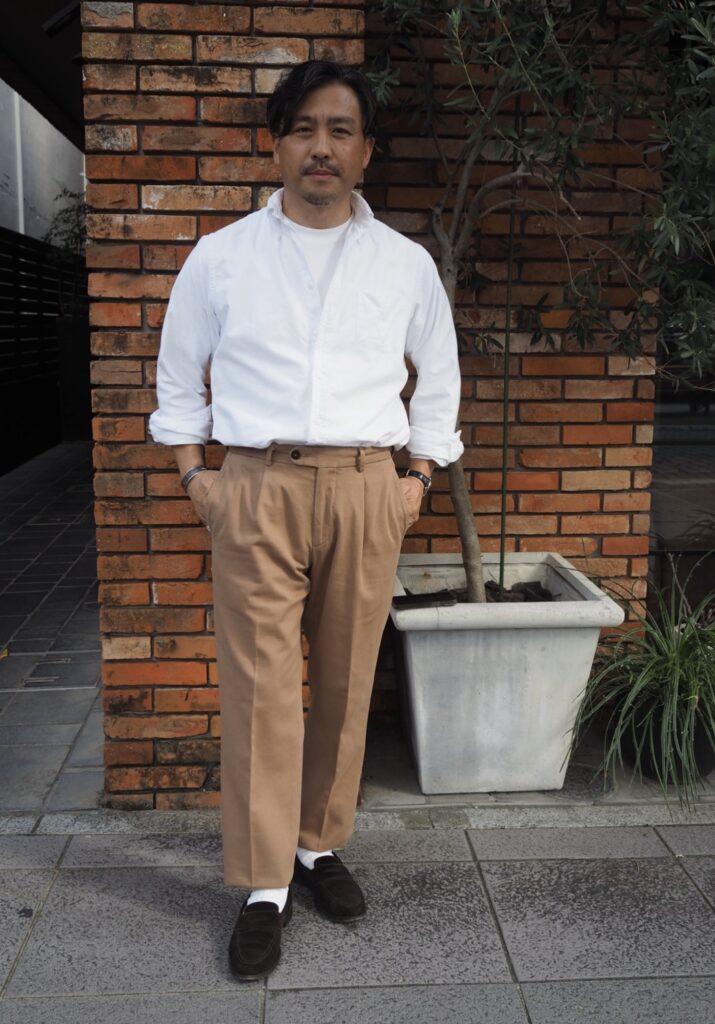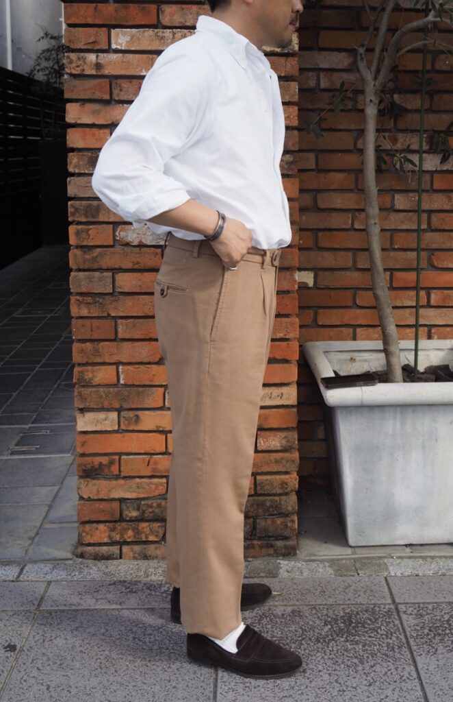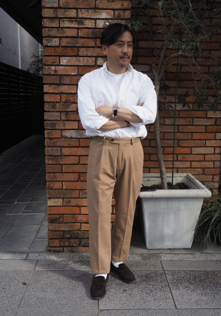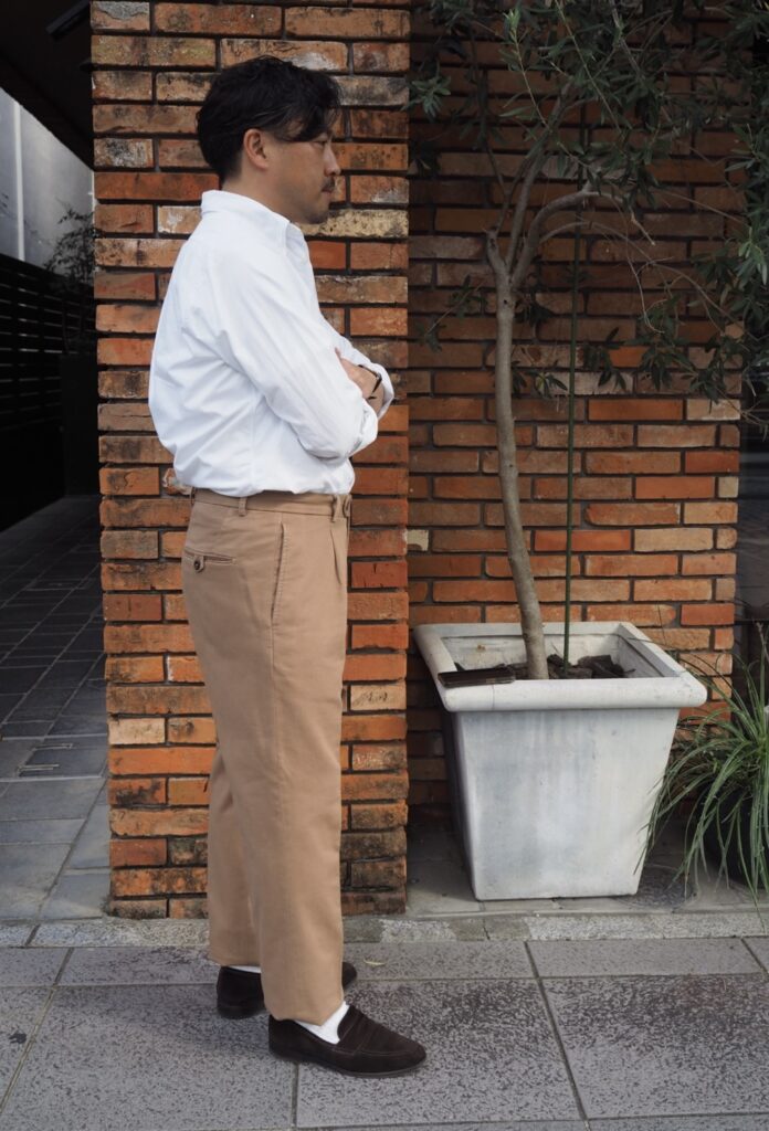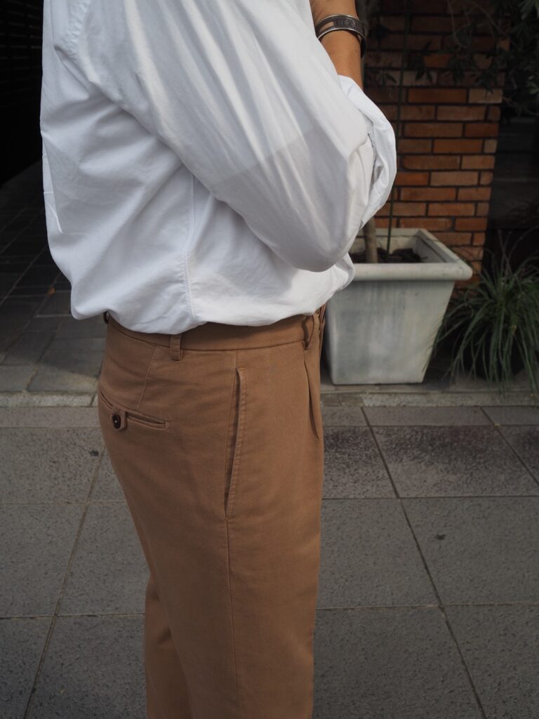 このパンツはチノパンをドレスに落とし込んだイタリア的美脚パンツです。このなんとも言えないハイブリッドな感じを味わっていただきたいです。