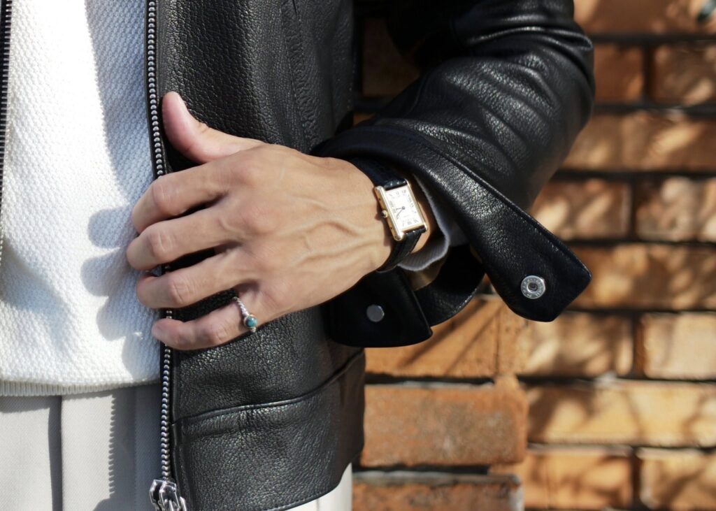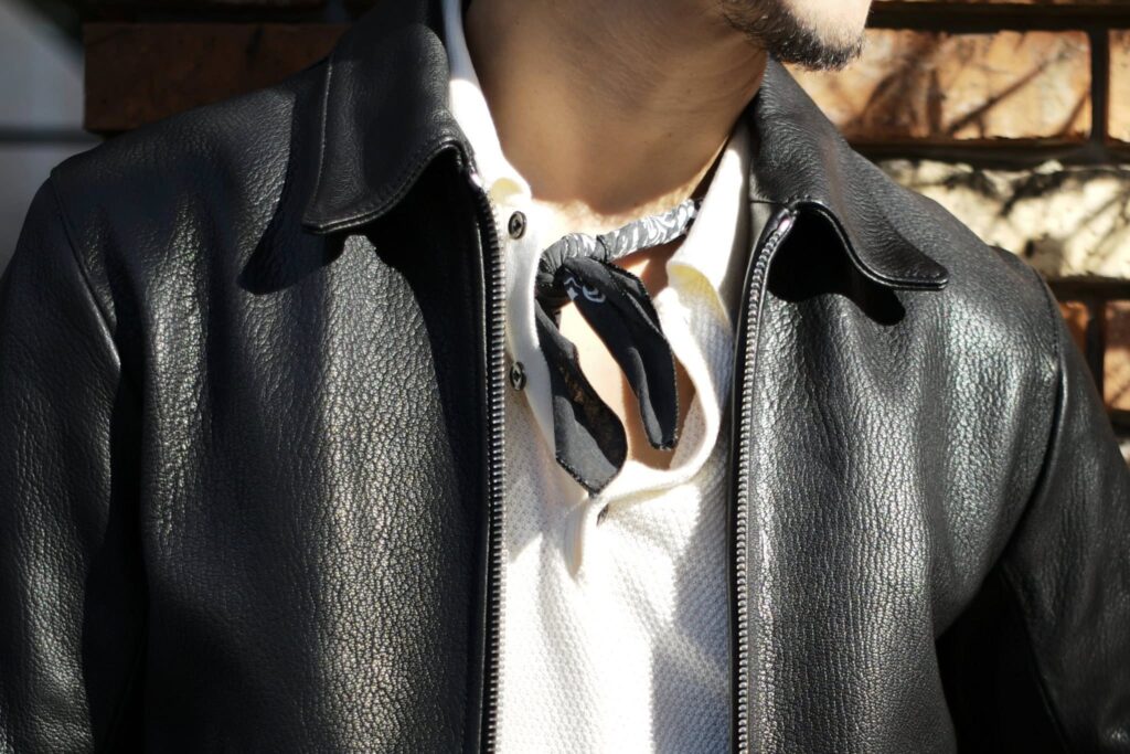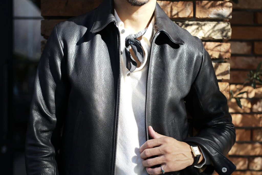 今季の新作は、レギュラーカラーのショートブルゾン。CINQUANTA(チンクワンタ)らしくミニマルなデザインですが、ゴートレザーを使用し、無骨さをプラス。ジップはシンプルにシルバーを採用。トレンドに左右されることなく長く着用していただけるアイテムとなりました。ラムレザーに比べると、やや硬い印象ですが、着込む事で体にフィットし、カラーも、奇を衒わずブラックですので、愛着のある1着になるのではないでしょうか?!