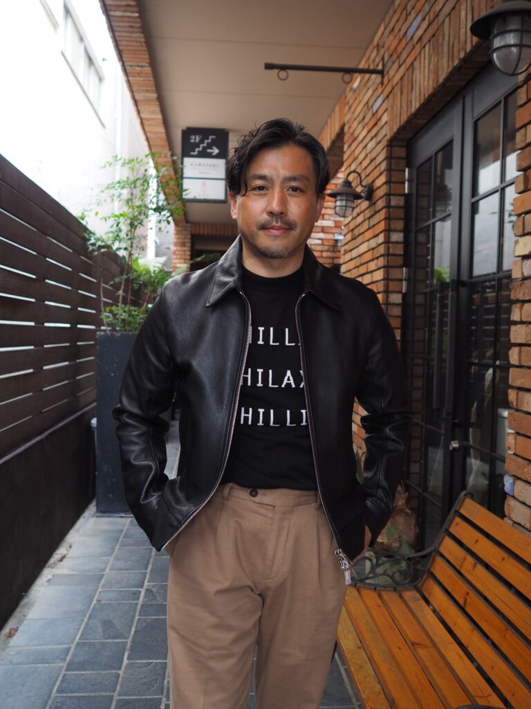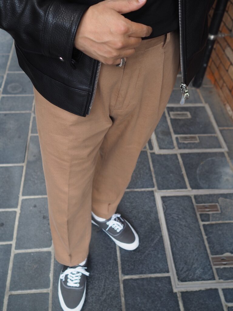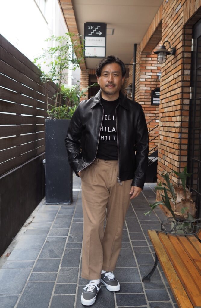 レタードTeeで遊びを加えてDEVOREの綺麗目チノでカジュアルになりすぎないようにし、スニーカーでゆるさを出してまとめてみました。