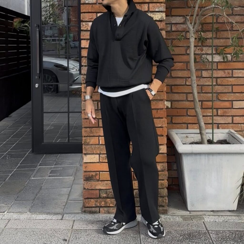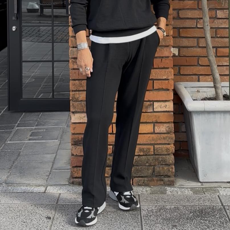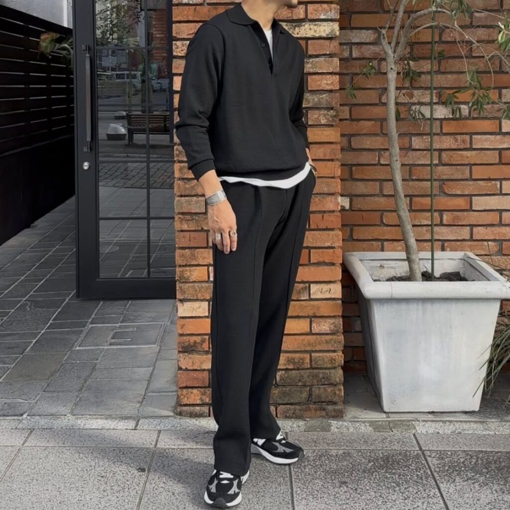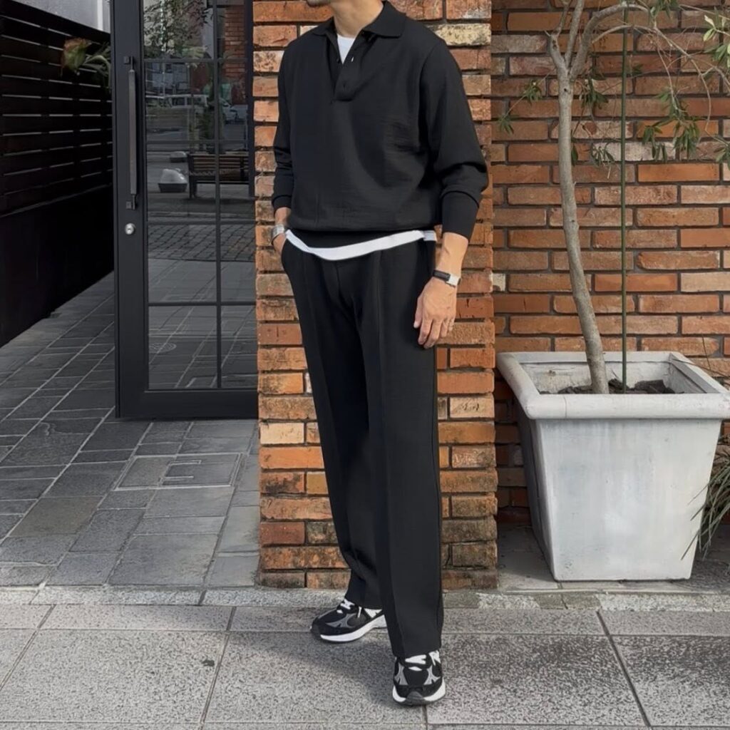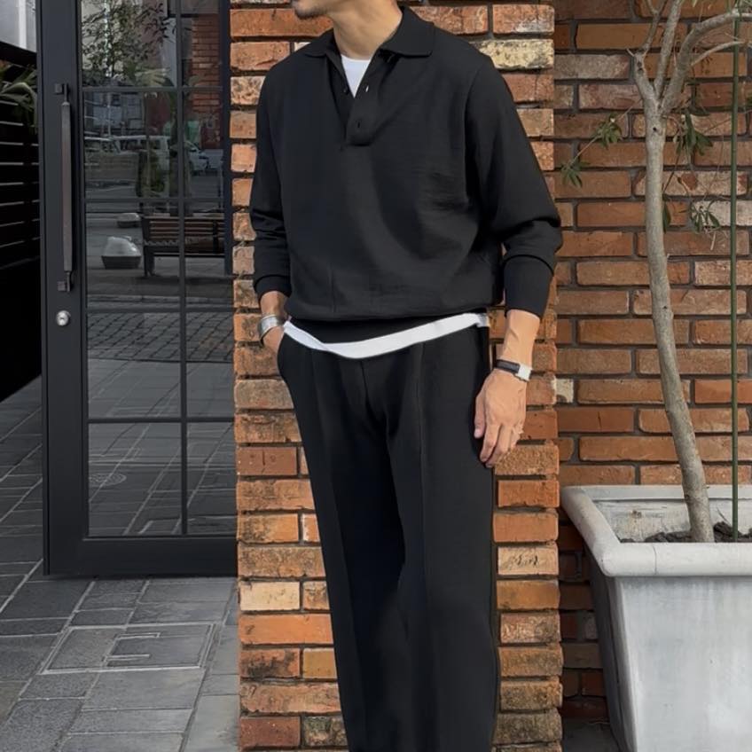 ウール100%の強撚糸でモダンに仕上げています。通常のウールとは異なり、強く撚りをかけた糸を使用することで、優れたキックバック性とドライタッチな肌触りを実現しています。程よくリラックス感のあるシルエットに仕立て、上品さと快適さを兼ね備えたデザインに仕上がりました。どちらも単体での着用は可能ですが、是非セットアップで楽しんで頂ければと思います。パンツは、ミラノリブ編みによるしっかりとした生地感で型崩れしにくい綺麗なシルエットをキープします。フロントにピンタックを施し、ドレスパンツの様な雰囲気に仕上がっています。この秋冬、休日のお供にいかがでしょう?!