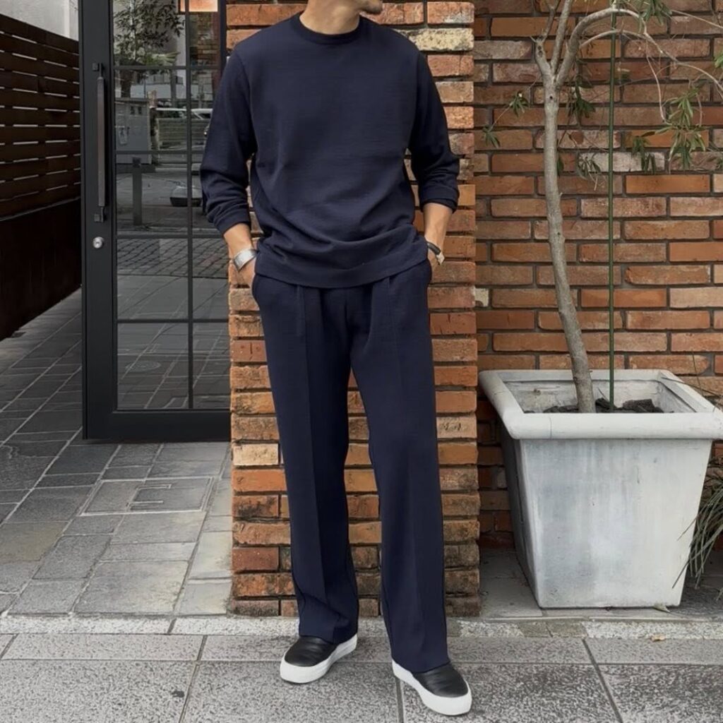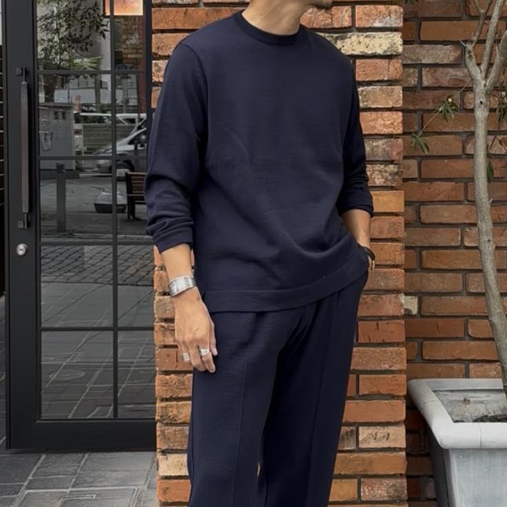 ウール100%の強撚糸でモダンに仕上げています。通常のウールとは異なり、強く撚りをかけた糸を使用することで、優れたキックバック性とドライタッチな肌触りを実現しています。程よくリラックス感のあるシルエットに仕立て、上品さと快適さを兼ね備えたデザインに仕上がりました。どちらも単体での着用は可能ですが、是非セットアップで楽しんで頂ければと思います。パンツは、ミラノリブ編みによるしっかりとした生地感で型崩れしにくい綺麗なシルエットをキープします。フロントにピンタックを施し、ドレスパンツの様な雰囲気に仕上がっています。この秋冬、休日のお供にいかがでしょう?!