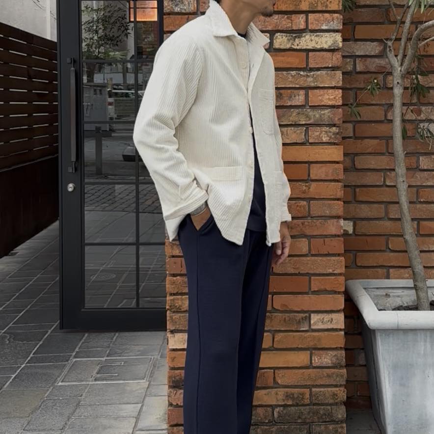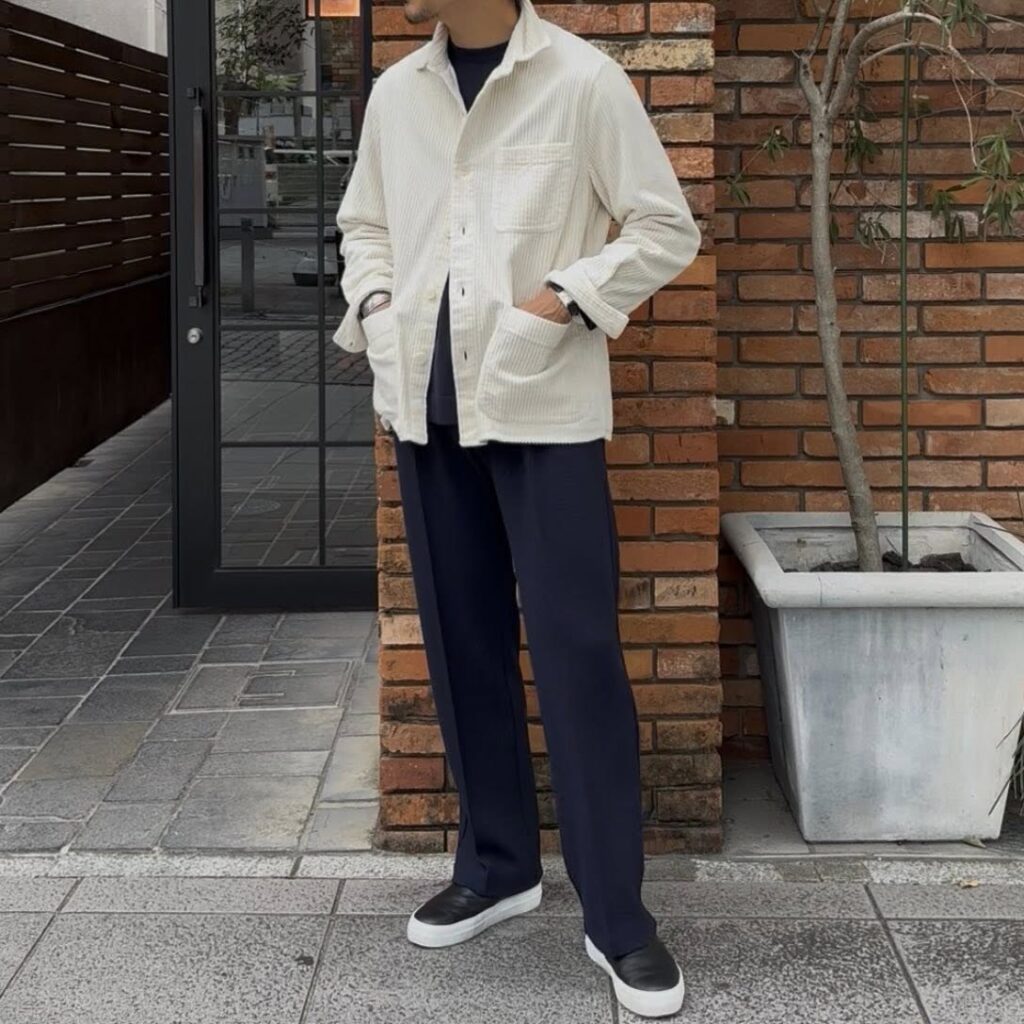 イーストハーバーサープラスのコーデュロイ、カヴァーオールジャケット。柔らかく、ナチュラルなカラーがリラックスしたこのジャケットが相性バッチリ。展示会でイメージしていたスタイリングが形になりました。こちらのジャケットは改めてご紹介させていただきます。