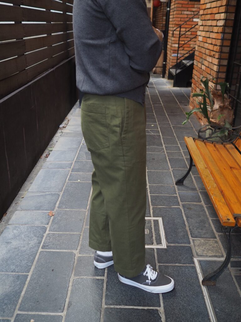 またワタリや裾幅など細すぎない絶妙なサイジングが何ともいえません。ガンガン履いてクタッとなった方がいい雰囲気でそうです。僕はクリースを入れて(中央の折線)履こうかなと今のところ思っています。