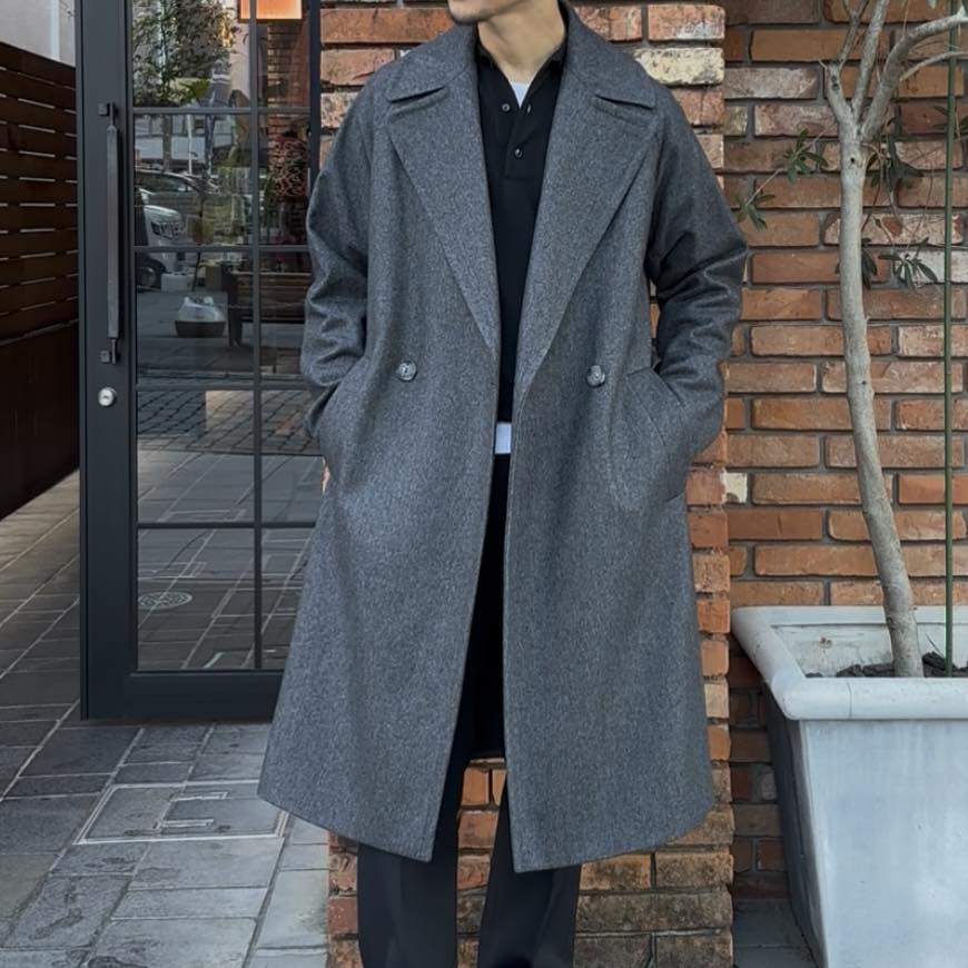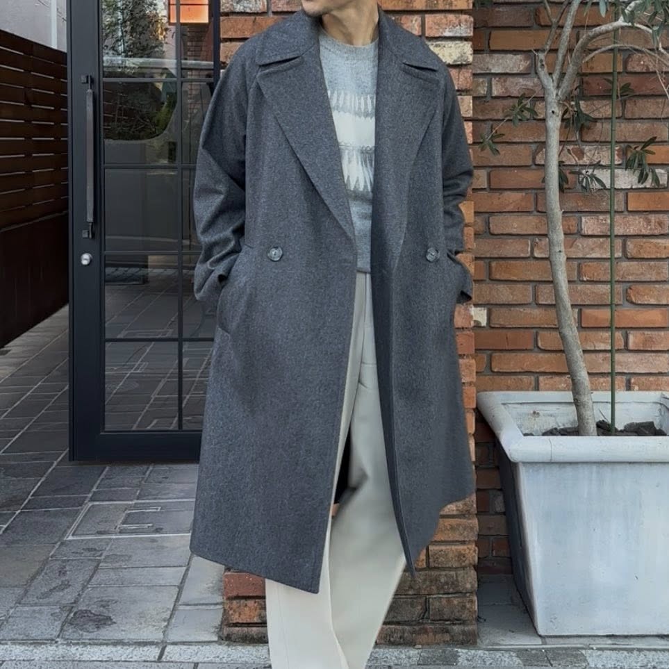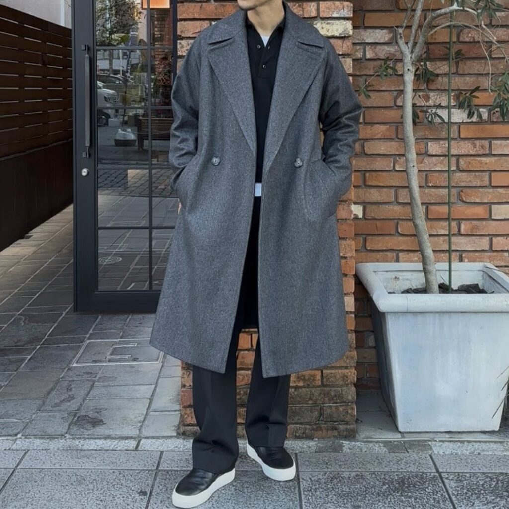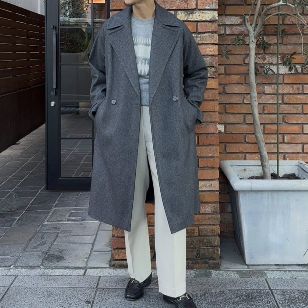 hevo(イーヴォ)の定番コート、ブリンディジが届きました。上質な素材とゆったりとした独特なシルエットが存在感を放つロングコート。産まれて初めて刈りとられた柔らかく高い保温性が魅力の「ヴァージンウール」で作られたメルトン生地。こちらを使い作られたダブルフロントのベルテッドコートです。ラグランスリーブとゆったりとしたシルエットのコートは、hevoならではの独特なシルエットを生み出し、現代のスーツスタイルにも合う、コンテンポラリーな雰囲気が漂うデザインに仕上げられています。もちろんカジュアルスタイルとの相性もいいので、スタイリングをお楽しみください。