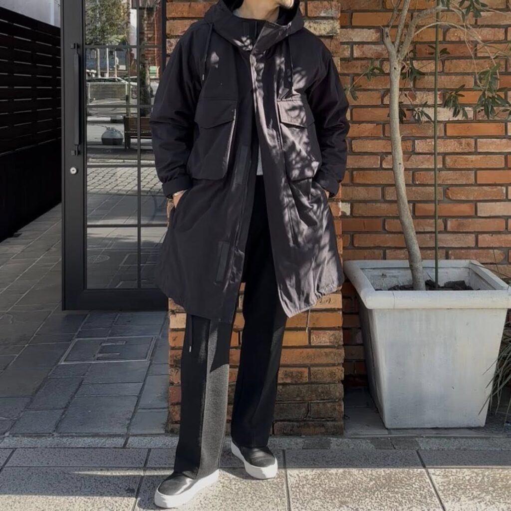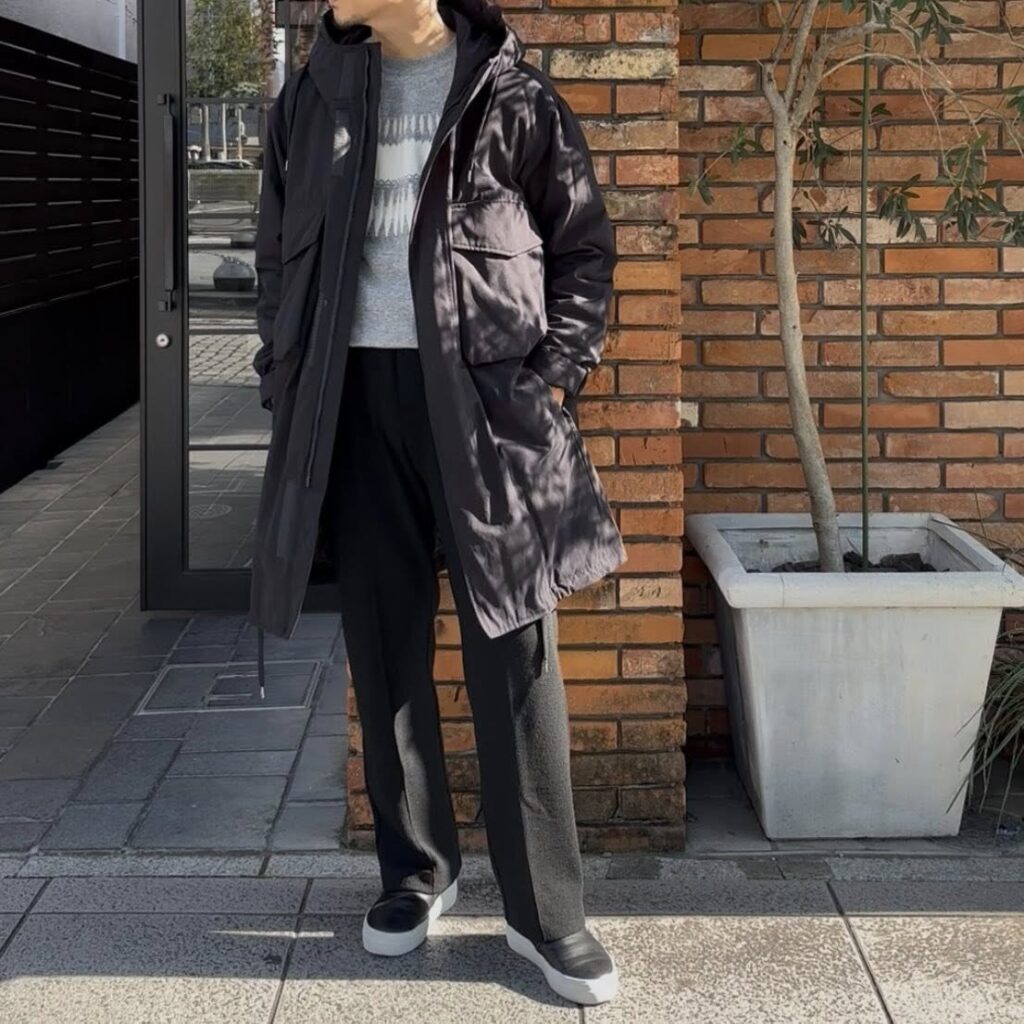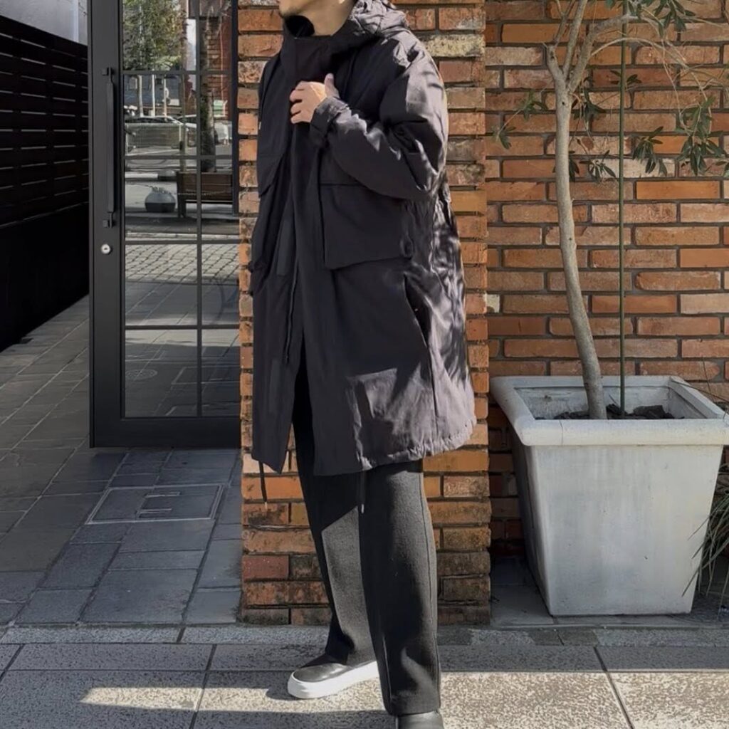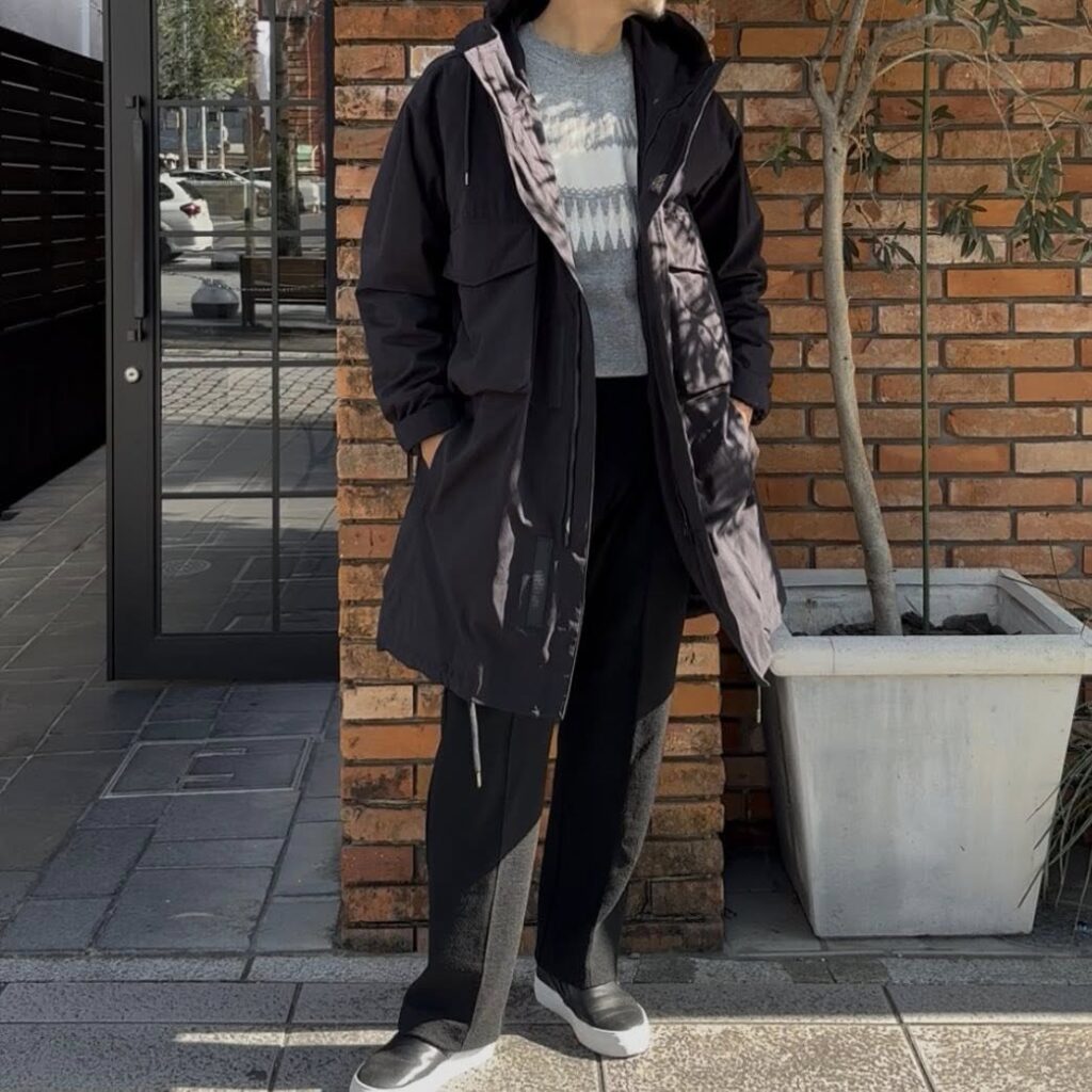 今季の新作は、大人が着れるモダンに仕上げたモッズコート。独特な素材感と程よくゆとりのあるシルエットが特徴的な、無骨でタフなデザインとなっています。フロントのマチ付きのポケットがアクセントとなってりますね。素材は、コットンベースの3者混素材で、ワックスコーティングを施しています。そうする事でベルベット素材を彷彿とさせるとろみのある風合いと、保温性をもたらす素材となっています。ワックスコーティングと言うと、Barbour(バブアー)のイメージを持たれるかもしれませんが、ベタつきや、これワックス付いてる!と、いうイメージではないのでご安心を。シンプルに一枚着て、スタイリングを決めたい方には特におすすめの1着です。色物ニットなどを合わせても良し、シンプルにブラック系でまとめてもカッコ良く決まります!!