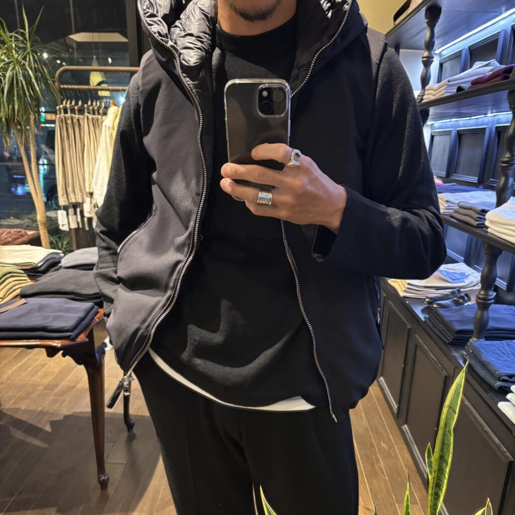 今季注目のアイテム、ハイグレードダウンブランドDUVETICAとコラボレーションした進化系ダウンコレクション。Giabsarchivioらしいテクニカルなナイロンファブリックを採用し、フロントのメタルファスナーをキーアクセントに、表にはダウンステッチを一切見せない、軽快感あふれる一着になっています。生地には、SILENT TWILL/サイレントツイルを採用。ブランドらしいテクニカルなコンフォートナイロンストレッチ素材。薄手ながらふっくらとしたソフトなタッチが秋冬らしく、縦横ストレッチが様々な動きに追従します。また、無地調の静かなツイル目面が強度を高めつつカジュアル感を軽減し、シーンを選ばず大人らしいシャープさを演出します。もちろん、同素材のパンツもご用意していますので、セットアップでの着用が可能です。