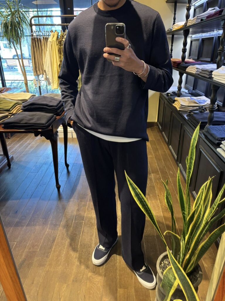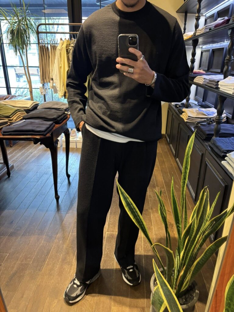 ウール100%の強撚糸でモダンに仕上げています。通常のウールとは異なり、強く撚りをかけた糸を使用することで、優れたキックバック性とドライタッチな肌触りを実現しています。程よくリラックス感のあるシルエットに仕立て、上品さと快適さを兼ね備えたデザインに仕上がりました。どちらも単体での着用は可能ですが、是非セットアップで楽しんで頂ければと思います。パンツは、ミラノリブ編みによるしっかりとした生地感で型崩れしにくい綺麗なシルエットをキープします。フロントにピンタックを施し、ドレスパンツの様な雰囲気に仕上がっています。この秋冬、休日のお供にいかがでしょう?!