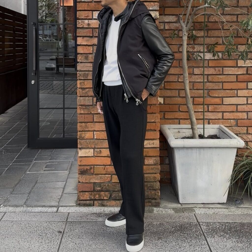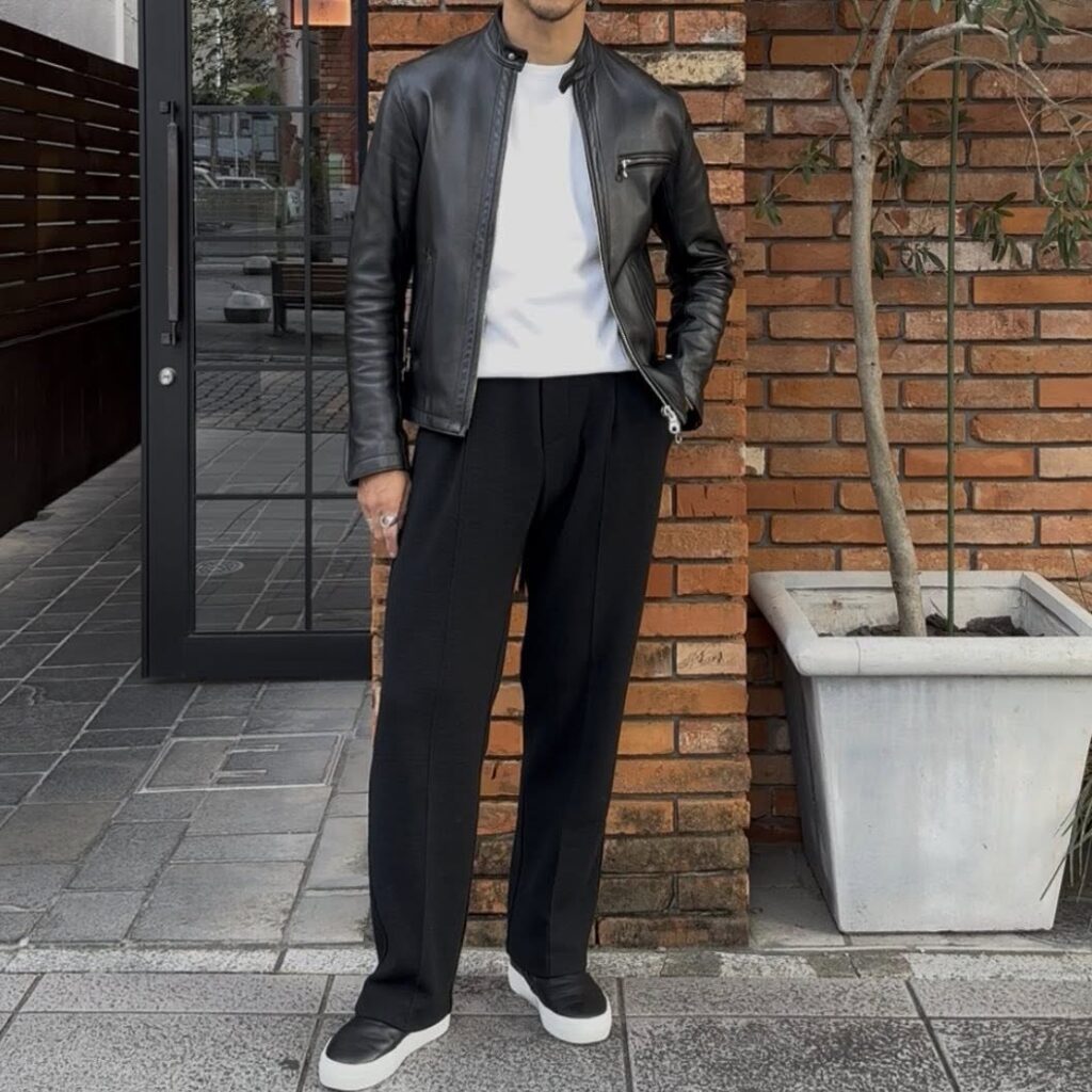 答えから言わせていただきますと、夏以外の3シーズンで着用可能です。ただ、真冬はレザーだけだと寒くてと言う方に、こんな着こなしのご提案。