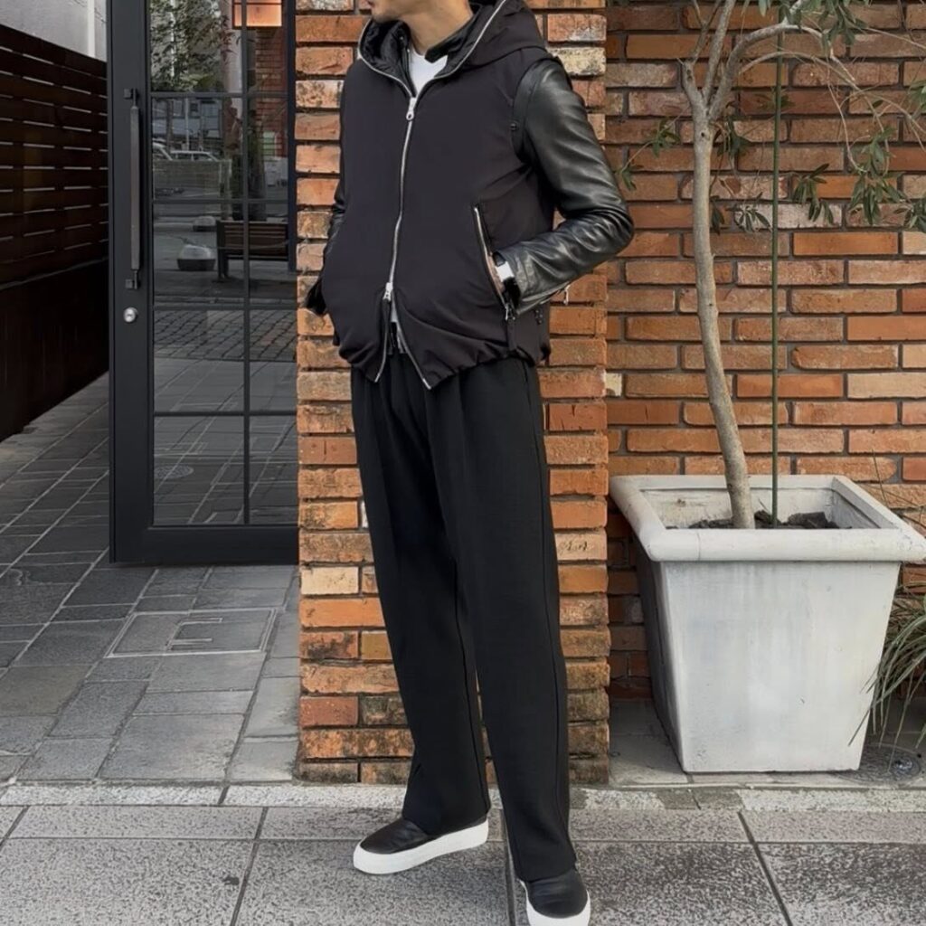 レザーの上から、ダウンベスト。この組み合わせは全然ありです。素材感の組み合わせに少し注意が必要ですが、今回入荷中の、giabsarchivio× DUVETICAのダウンベストは、CINQUANTAのレザーと相性抜群です。