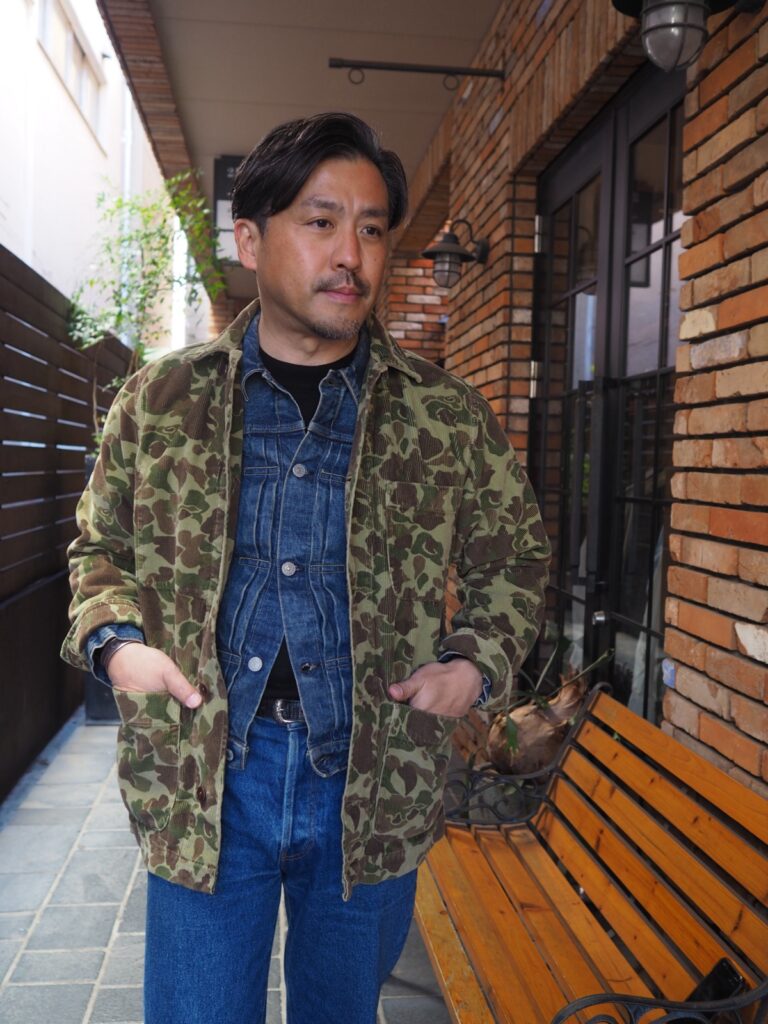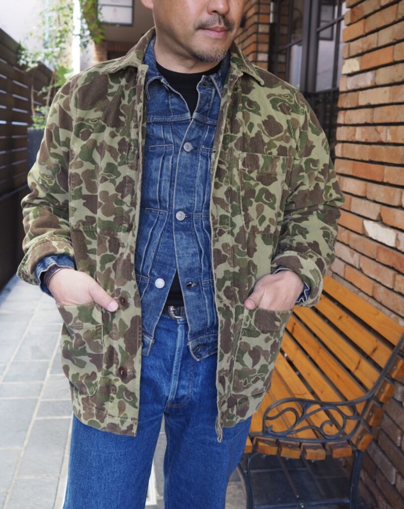 今日はちょと抵抗がある方もいらっしゃると思いますがGジャンGパン。アウターにはチェサピークスのカモフラカバーオールを合わせてみました。
