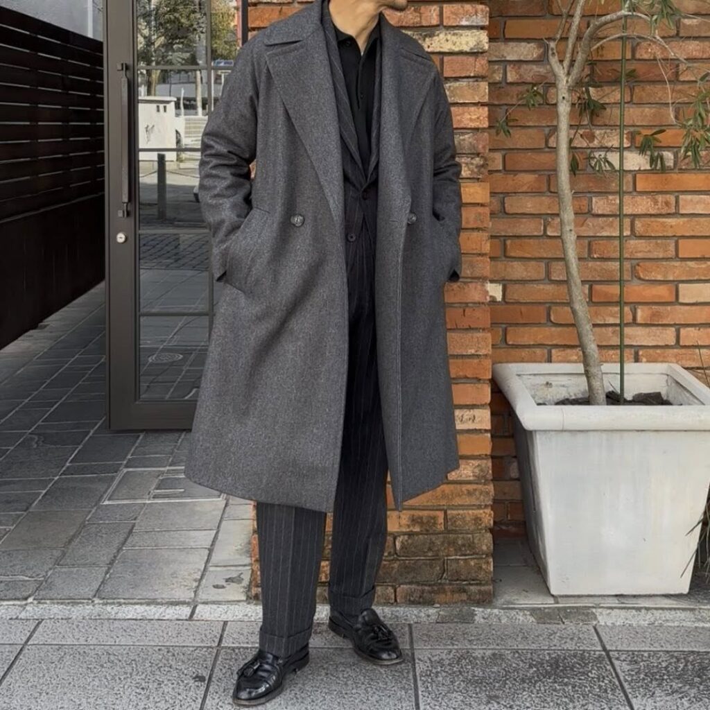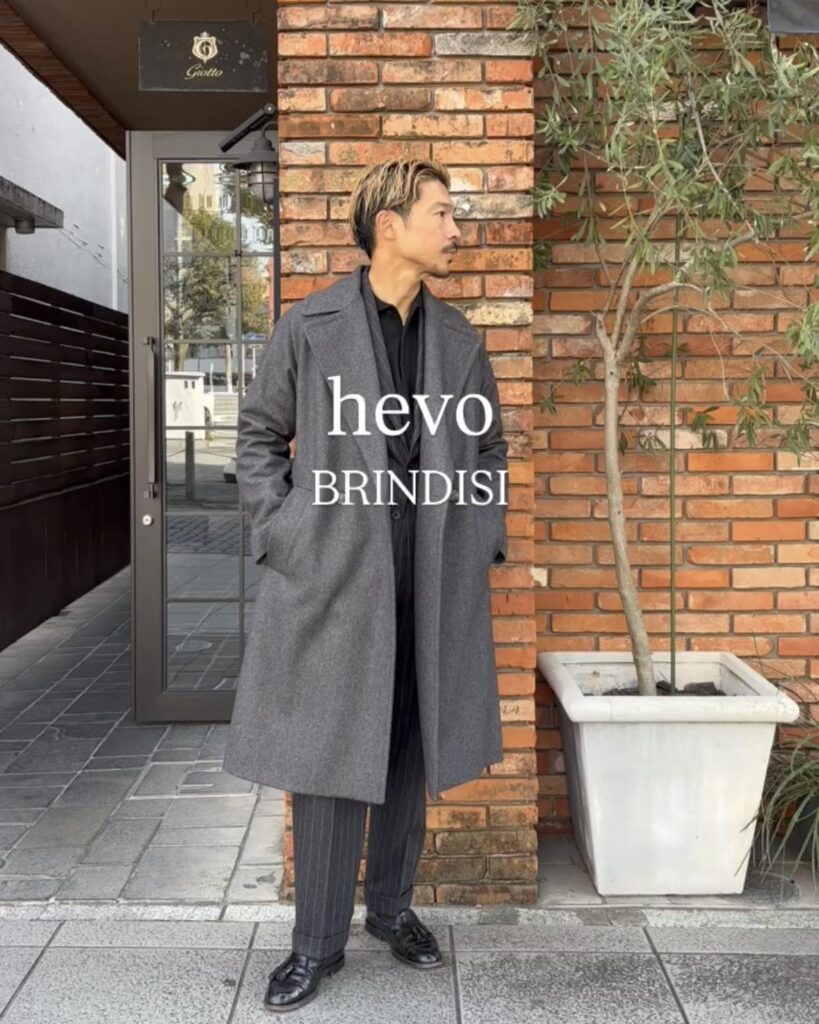 hevo(イーヴォ)の定番コート、ブリンディジが届きました。上質な素材とゆったりとした独特なシルエットが存在感を放つロングコート。産まれて初めて刈りとられた柔らかく高い保温性が魅力の「ヴァージンウール」で作られたメルトン生地。こちらを使い作られたダブルフロントのベルテッドコートです。ラグランスリーブとゆったりとしたシルエットのコートは、hevoならではの独特なシルエットを生み出し、スーツスタイルにも合う、コンテンポラリーな雰囲気が漂うデザインに仕上げられています。