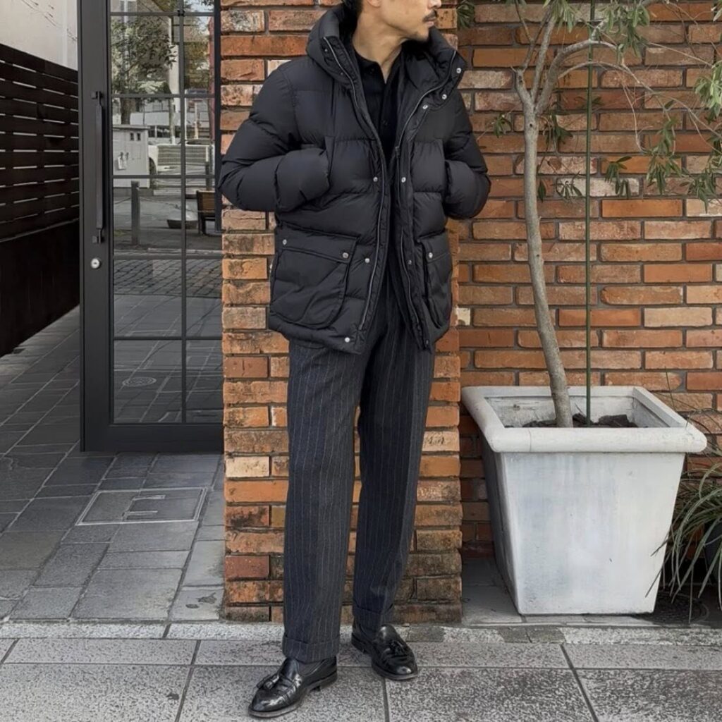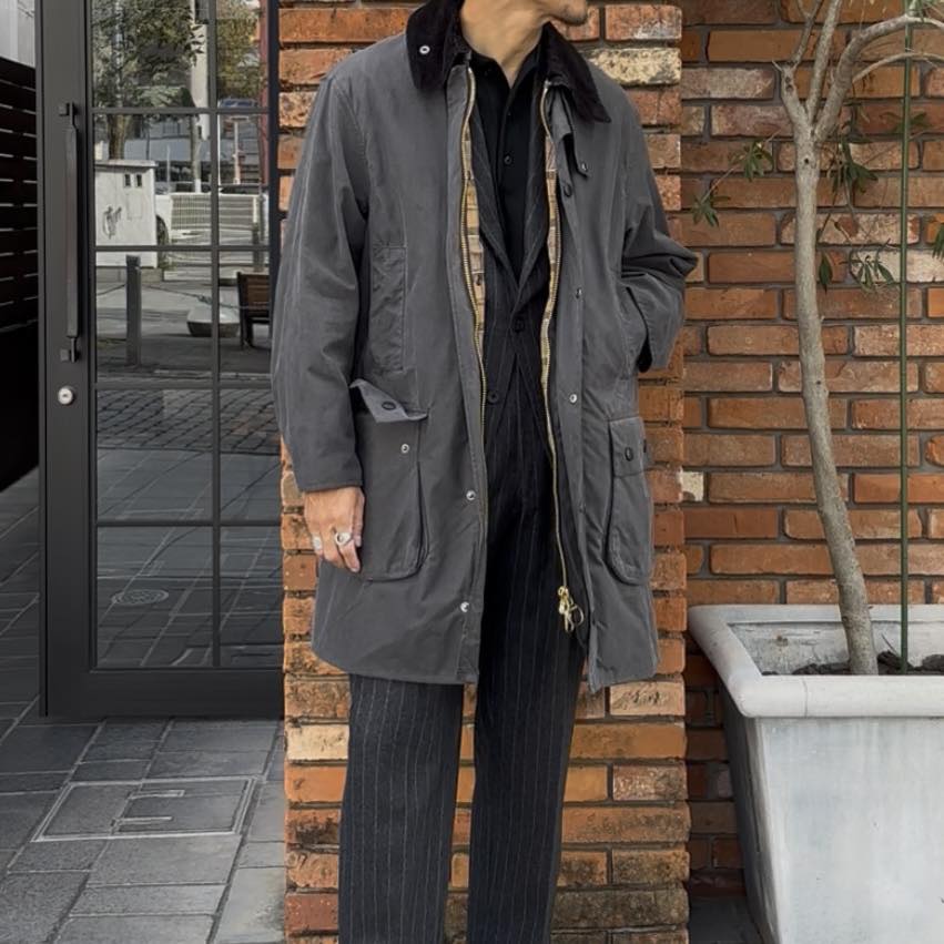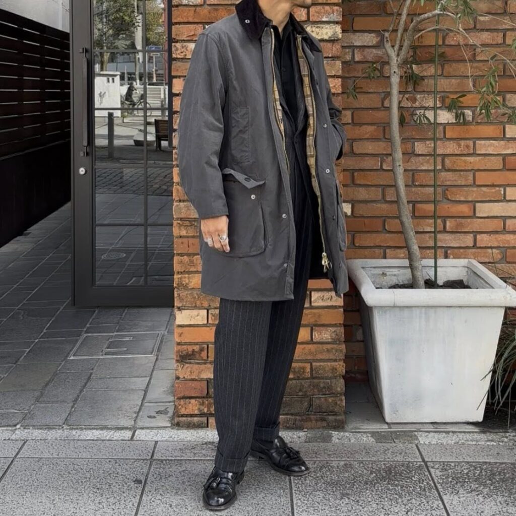 ラギット感のあるBarbour合わせが、男らしくてカッコいい。オイルドジャケットは、防水、防寒性に優れているため、見た目以上に暖かいのも魅力の一つ。オーセンティックなデザインで長く愛用できますし、オイルドジャケットならではのエイジングもお楽しみいただけます。