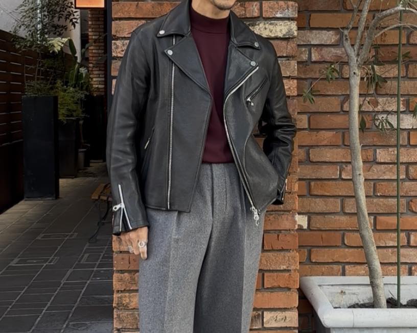 ネイビーブレザーや、ジャケットはもちろん、レザージャケットのインナーとして非常に便利な一枚。