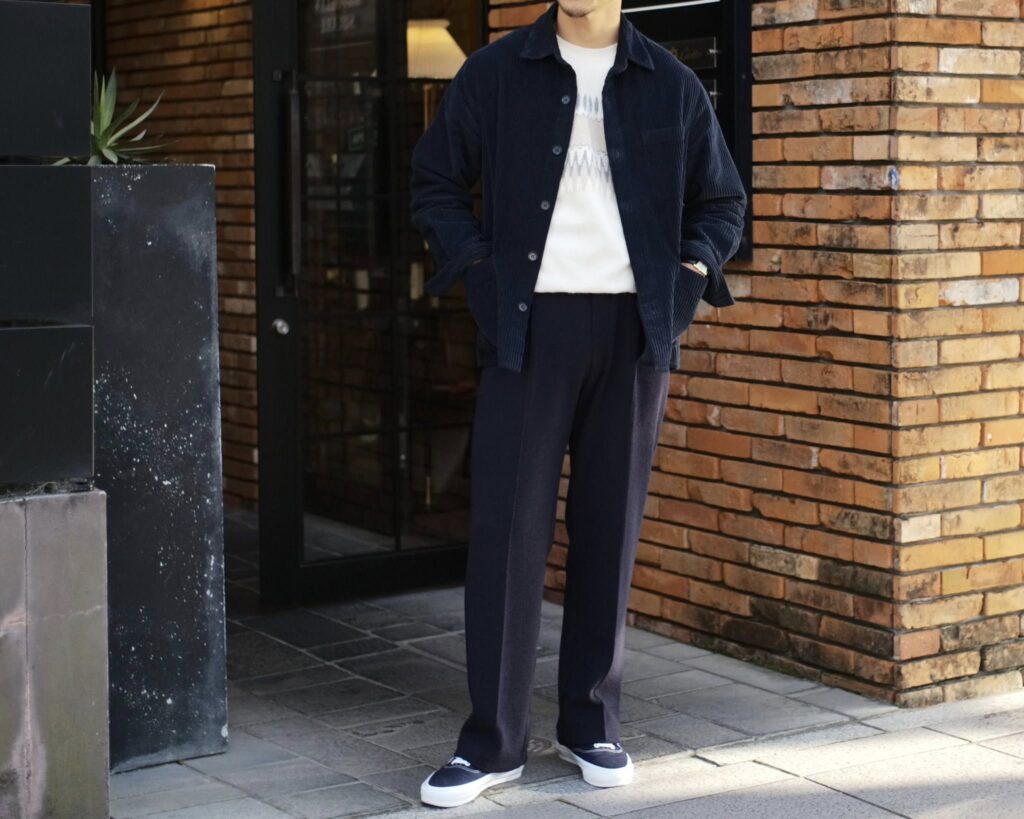 ウール100%の強撚糸でモダンに仕上げています。通常のウールとは異なり、強く撚りをかけた糸を使用することで、優れたキックバック性とドライタッチな肌触りを実現しています。程よくリラックス感のあるシルエットに仕立て、上品さと快適さを兼ね備えたデザインに仕上がりました。どちらも単体での着用は可能です。セットアップでも楽しんで頂けるので、サイズの合う方は是非。パンツは、ミラノリブ編みによるしっかりとした生地感で型崩れしにくい綺麗なシルエットをキープします。フロントにピンタックを施し、ドレスパンツの様な雰囲気に仕上がっています。これを履くと、こればかりになってしまいますね・・・。笑