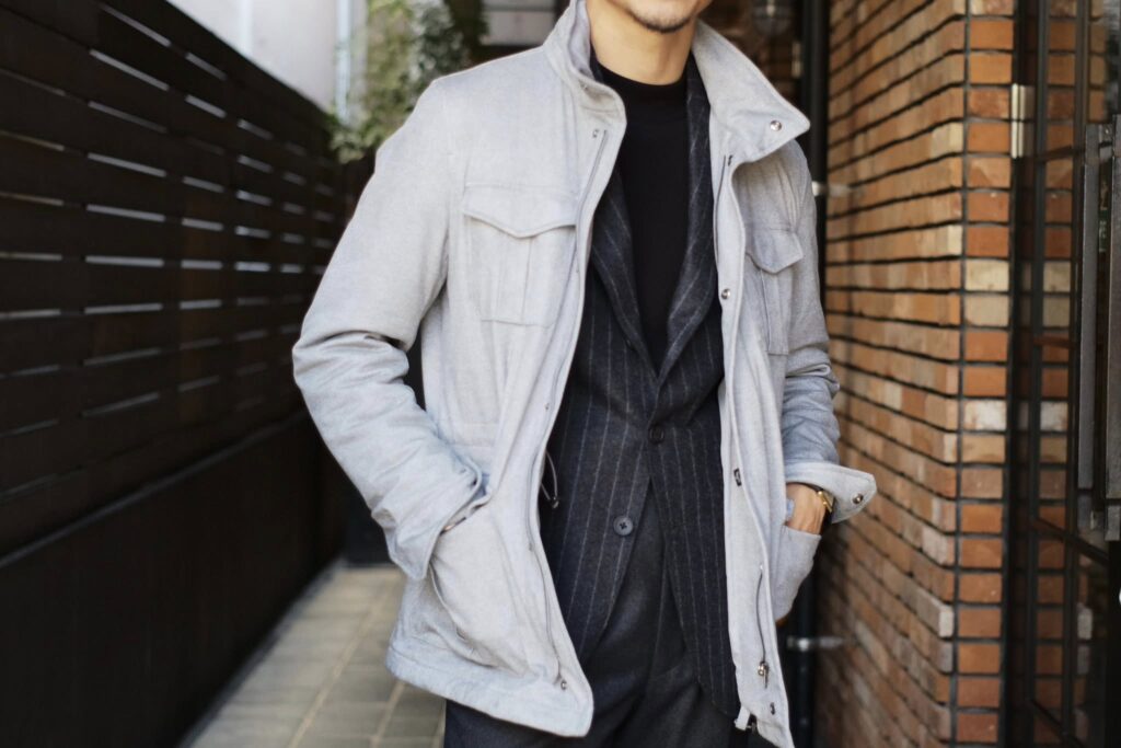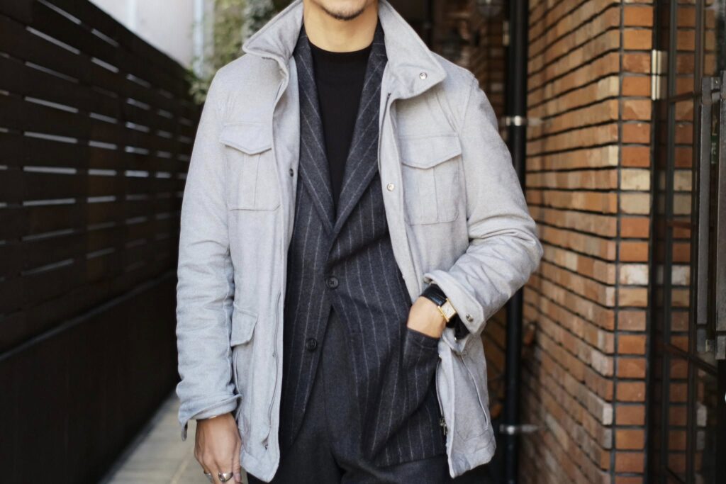 HERNO(ヘルノ)から届いた新作は、旅をキーワードにラグジュアリー&コンフォータブルに特化したコレクションライン HERNO RESORT。M-65型のブルゾンです。ミリタリー感が強いM-65も、上品なエコスエードを使用することで、都会的で洗練された表情に。ストレッチも効いた素材は、しっとりとした風合いが特徴で軽く柔らかな着心地と上品な表情を併せ持つ素材で、メランジ仕立てで、高級感のある表情に仕上がっています。フードは収納可能なインサイドフード仕様となっています。