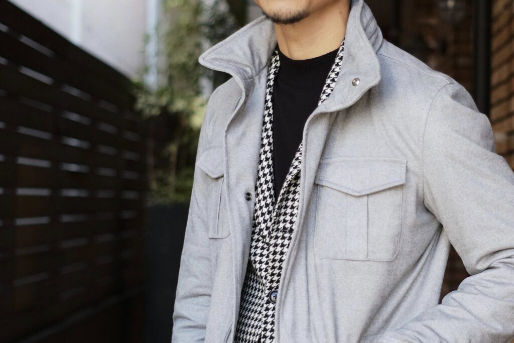 今回は、ブラック系のトーンに合わせたスタイリングとなっていますが、ネイビー系との相性もいいので是非!気をつけたい所をいうと、ジャケパンのスタイリングで、グレーのパンツ(スラックス)と近いトーンでの合わせはボケてしまうので気をつけてください。秋冬ですので、チャコールグレーのパンツを合わせる方が多いと思いますので、その場合は大丈夫です。ご参考までに。