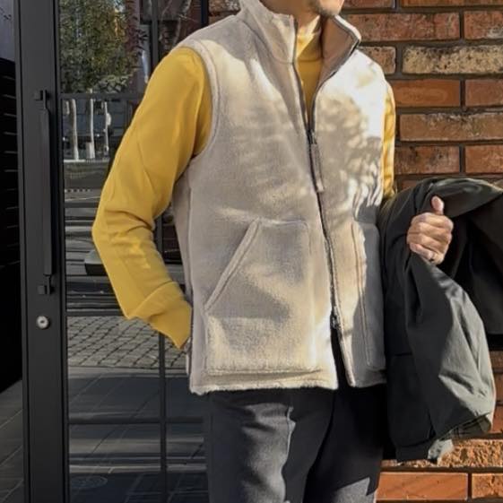 表側には、ダウンアイテムにも使われる軽量で高密度なミリタリーリップ生地を採用、 裏側はマイクロボア素材で仕立てており、スタイルに合わせて使い分けられるリバーシブル仕様となります。前たては開閉しやすいファスナー仕様、両脇にはファスナースリットを設けており、 腕の可動域を広げながら、ボトムのポケットにも手が入れやすく、重ね着を快適に楽しめる設計になっています。タウンユースはもちろん、アウトドアやアクティブシーンでも活躍する、防寒性の高いウェアとなります。