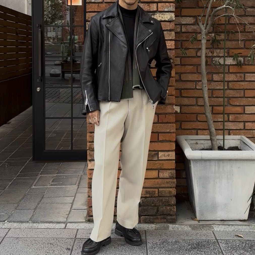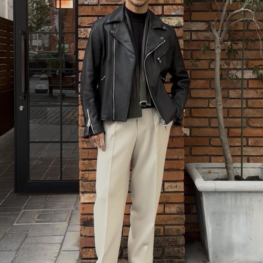 CINQUANTA(チンクワンタ)らしくミニマルなデザインですが、ゴートレザーを使用し、さらに無骨さをプラス。ジップはシンプルにシルバーを採用。トレンドに左右されることなく長く着用していただけるアイテムとなりました。ラムレザーに比べると、やや硬い印象ですが、着込む事で体にフィットし、カラーも、奇を衒わずブラックですので、愛着のある1着になるのではないでしょうか?!