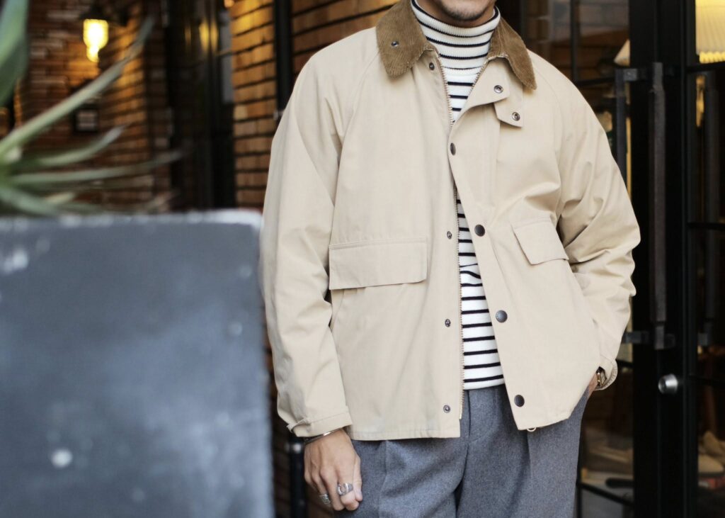 バブアーの数あるラインナップの中でも、特に注目を集めているショートレングスジャケットの「ボロウデイル」。男女問わず高い人気を得るスペイや、トランスポートをベースに、各部をアレンジした日本国内限定モデルとなっています。こちらはシーズンレスで着用可能なピーチスキン素材を採用。ピーチスキンは、きめ細やかなポリエステル生地を起毛させ、短く刈り揃えることで文字通り桃の皮の表面のような柔らかくて滑らかなタッチ感が特徴のファブリックです。しっとりとした風合いで上品な雰囲気を醸し出してくれます。季節を問わず着用して頂きやすい軽やかな着用感もポイントとなっています。デザインにもこだわっており、特徴的なポケットディテールは定番モデルのトランスポート、スペイそれぞれのデザインをベースにしながらミックスさせた仕上がりとなっています。