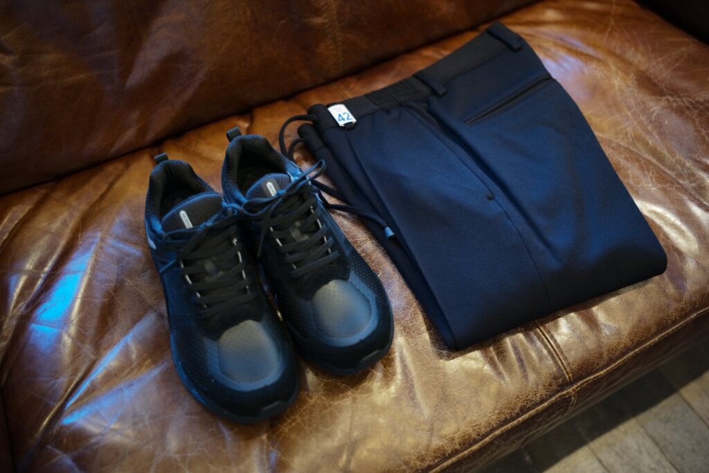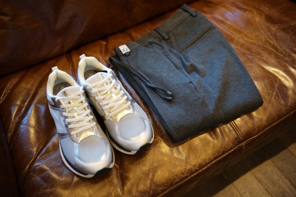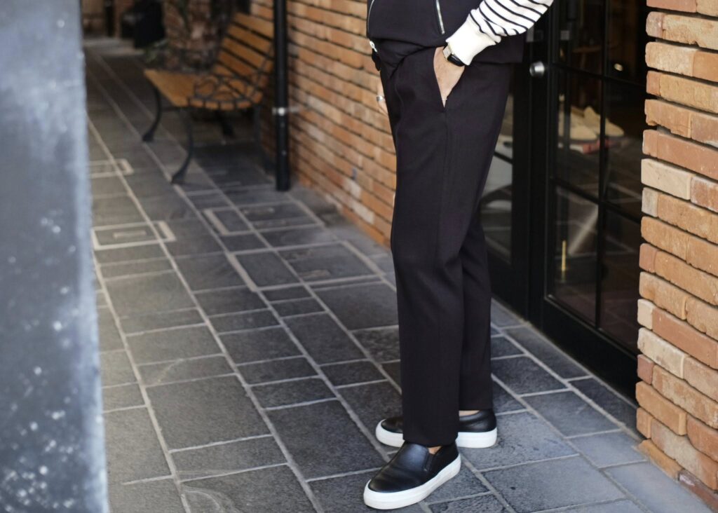 足元は、スニーカーはもちろん、レザースニーカーや革靴(レザーソールではない物)との相性が良いですね。