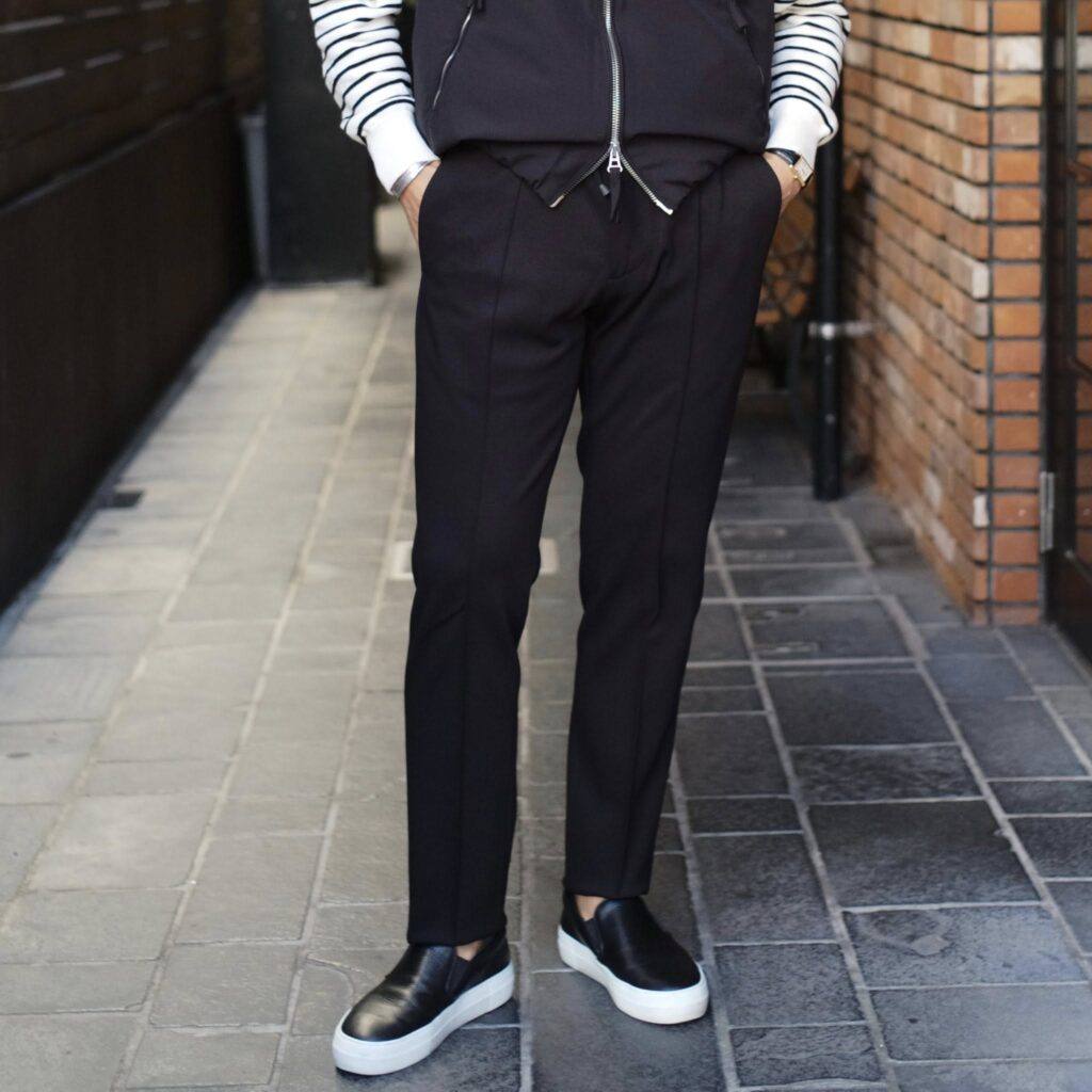 カルゼジャージーと言われる素材は綾目の立ったウールサキソニー素材風で、強度が強くパンツのシルエットを綺麗に見せてくれます。柔らかくストレスを感じない履き心地ですが、型崩れしにくい素材が特徴的で、素材としてはレーヨンとナイロン、ポリウレタンを混紡しておりハリコシの中に適度な柔らかさがあり穿き心地は定番ジャージーと遜色ない仕上がりとなっています。スポーティなスタイリングだけど綺麗めに魅せたい方にはピッタリです。丈はスッキリジャスト丈が一番カッコ良くスタイリッシュに見えますね。