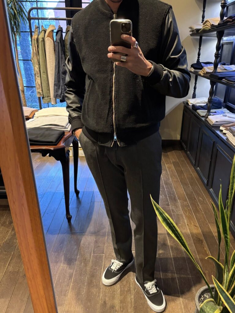 本日は、チャコールグレーをブラックのブルゾンに合わせてコーディネートを組みました。