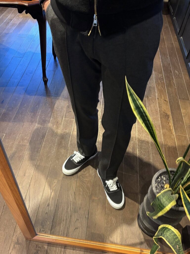 カルゼジャージーと言われる素材は綾目の立ったウールサキソニー素材風で、強度が強くパンツのシルエットを綺麗に見せてくれます。柔らかくストレスを感じない履き心地ですが、型崩れしにくい素材が特徴的で、素材としてはレーヨンとナイロン、ポリウレタンを混紡しておりハリコシの中に適度な柔らかさがあり穿き心地は定番ジャージーと遜色ない仕上がりとなっています。スポーティなスタイリングだけど綺麗めに魅せたい方にはピッタリです。丈はスッキリジャスト丈が一番カッコ良くスタイリッシュに見えますね。