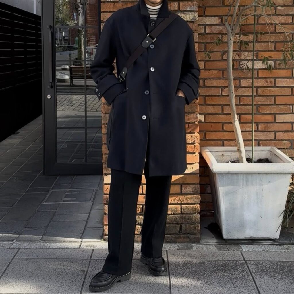 MACKINTOSH(マッキントッシュ)のネイビーのコートに、 Blu Bre(ブルブレ)のブラックのニットパンツ、Vandori(ヴァンドリ)のボーダーニットをポイントにしたシンプルなスタイリング。