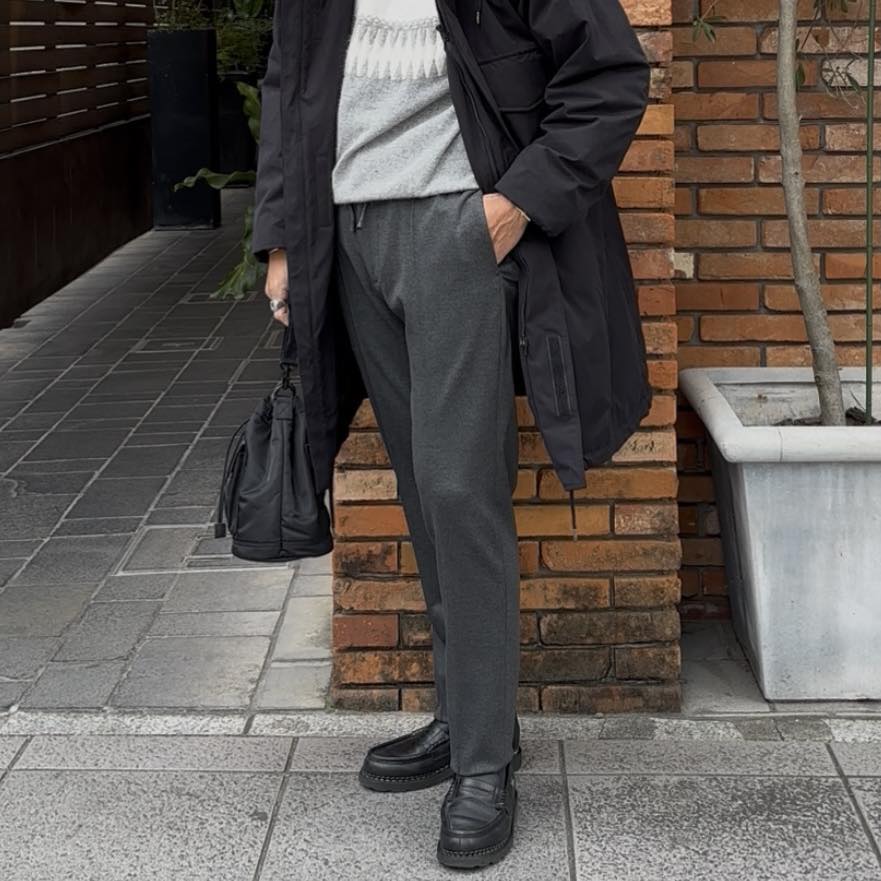 カルゼジャージーと言われる素材は綾目の立ったウールサキソニー素材風で、強度が強くパンツのシルエットを綺麗に見せてくれます。柔らかくストレスを感じない履き心地ですが、型崩れしにくい素材が特徴的で、素材としてはレーヨンとナイロン、ポリウレタンを混紡しておりハリコシの中に適度な柔らかさがあり穿き心地は定番ジャージーと遜色ない仕上がりとなっています。スポーティなスタイリングだけど綺麗めに魅せたい方にはピッタリです。丈はスッキリジャスト丈が一番カッコ良くスタイリッシュに見えますね。