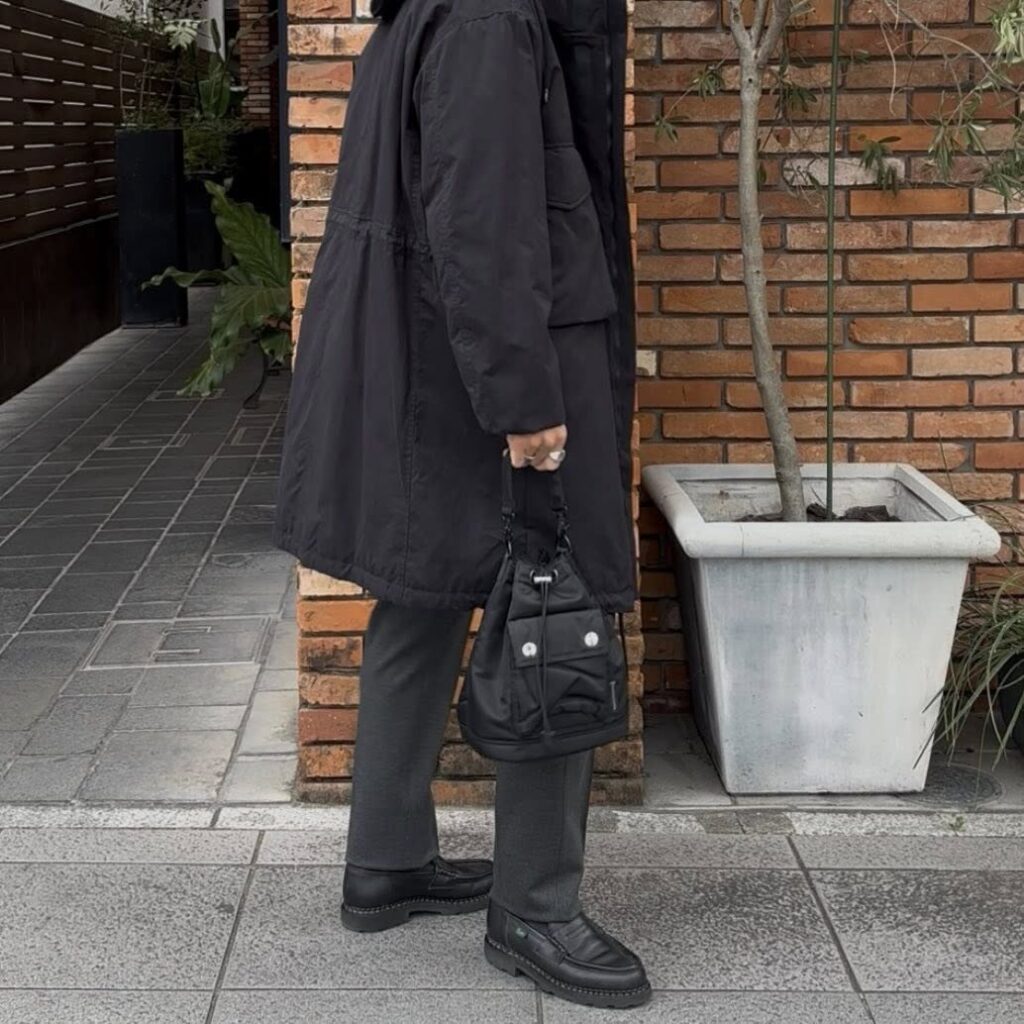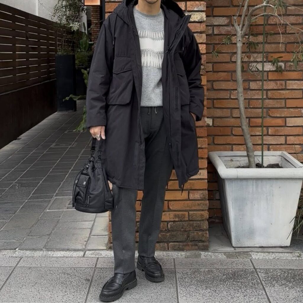 スタイリングに合わせたBagは、こちらも新入荷のMACKINTOSH(マッキントッシュ)。HERNO(ヘルノ)のモッズコートはサイズ50を着用しています。普段48〜52くらいのサイズ感です。ミリタリーのアウターだけあって、大きめの着用でもサマになりますね。