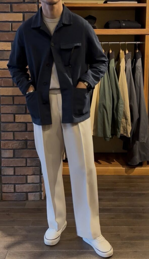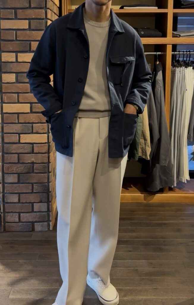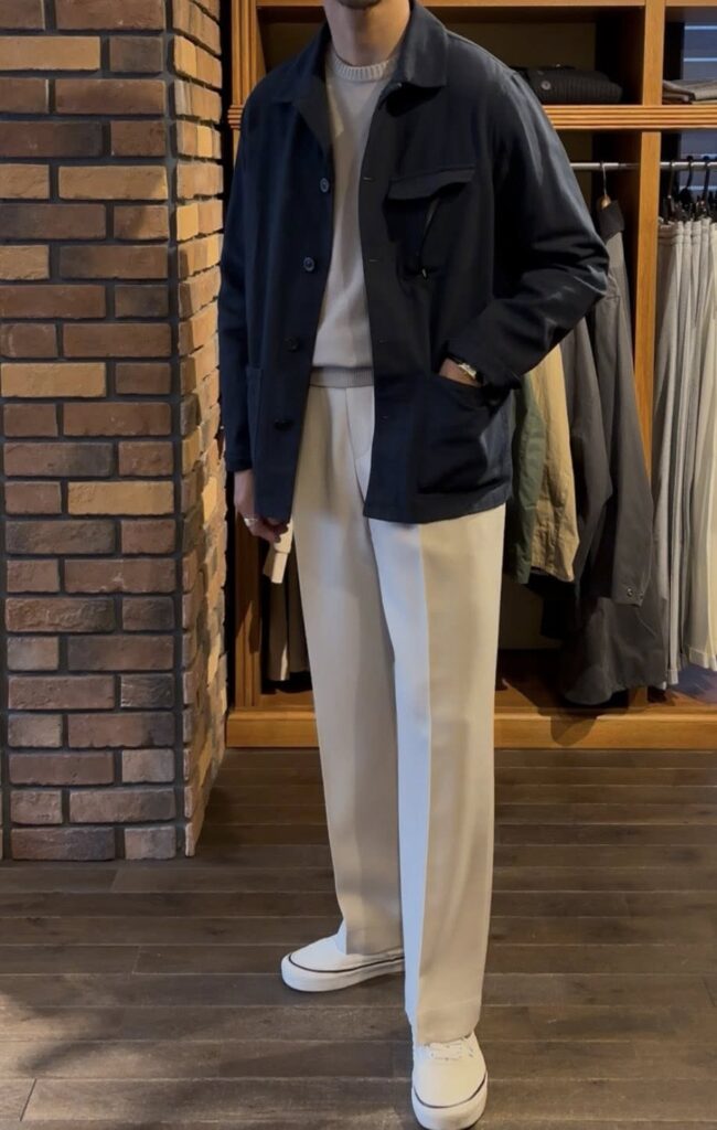 少し春を意識するタイミングから着用可能で、春、夏、秋と着用可能なこちらは、カラーもネイビーですのスタイリングパターンは多いかと。なので、出来るだけ多くのスタイリングをご紹介できればと思います。今回は、Sサイズを着用しています。Sサイズは早くも残り1点となりますので、気になる方はお早めに。