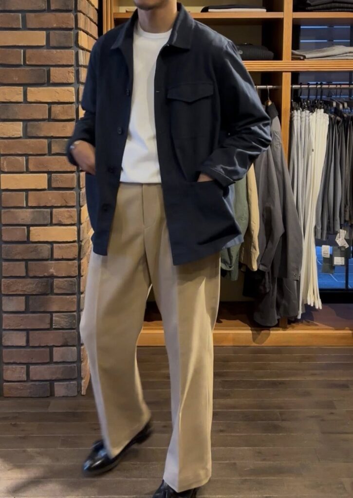 少し春を意識するタイミングから着用可能で、春、夏、秋と着用可能なこちらは、カラーもネイビーですのスタイリングパターンは多いかと。なので、出来るだけ多くのスタイリングをご紹介できればと思います。今回は、Mサイズを着用しています。Mサイズも残り1点となりますので、気になる方はお早めに。