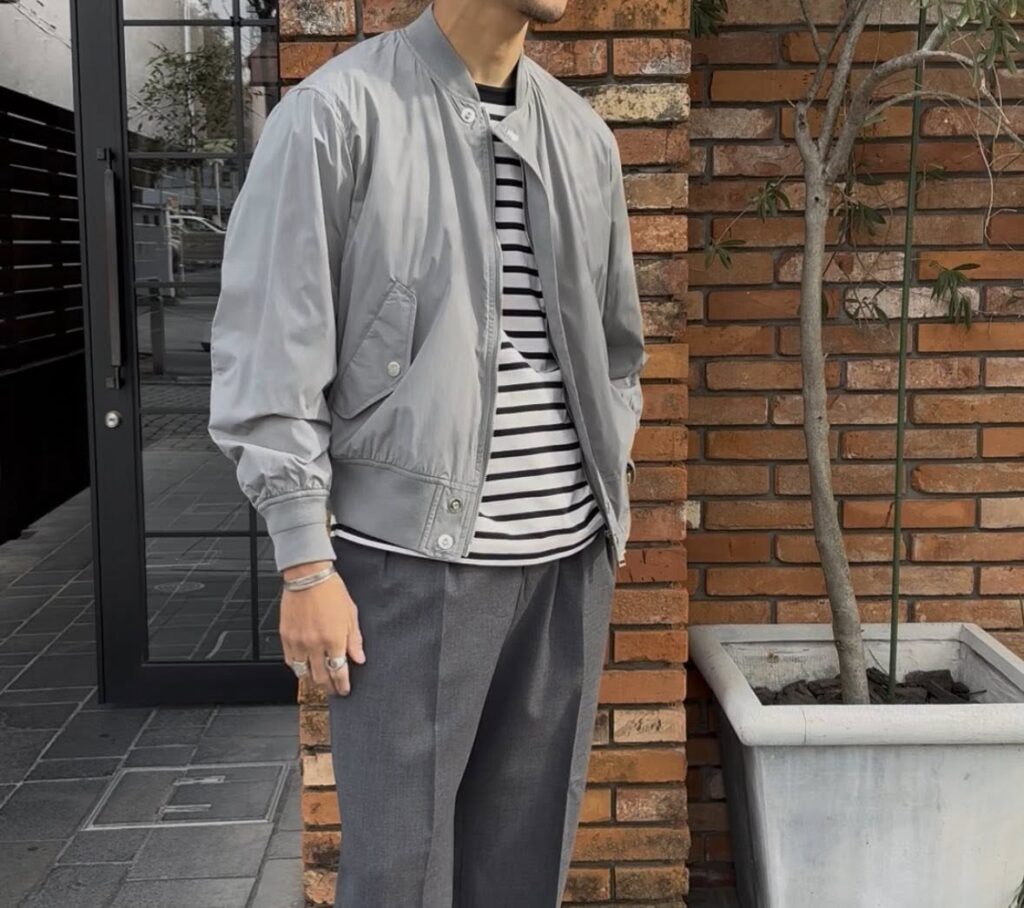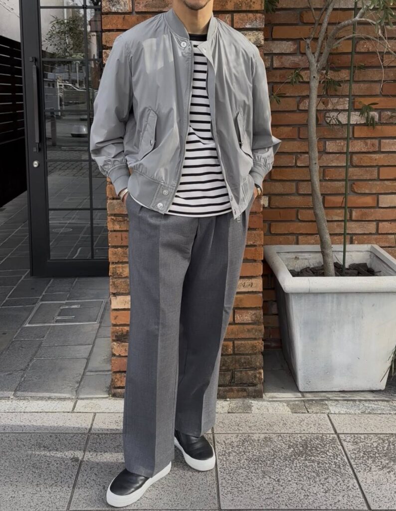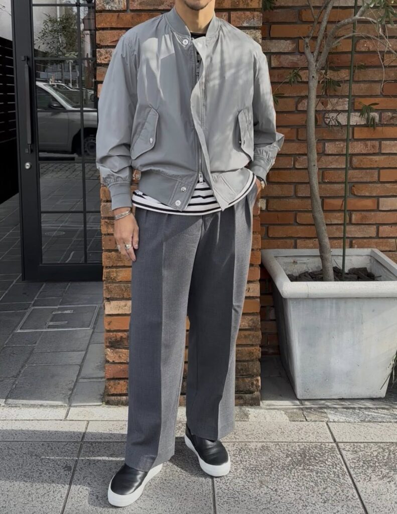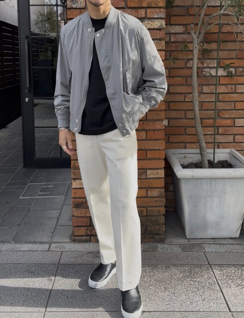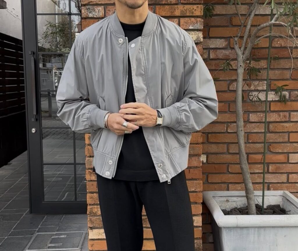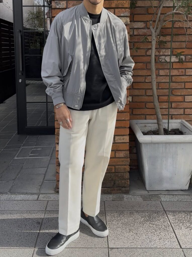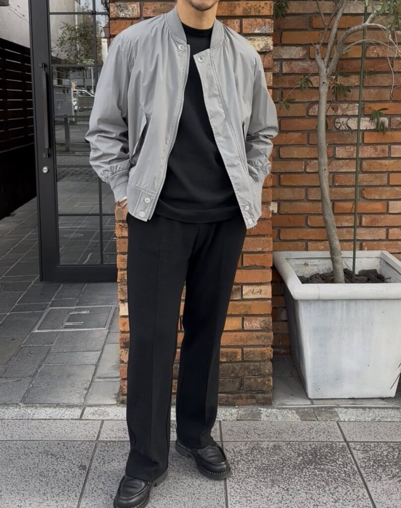 MA-1ですと、ブラックやオリーブ系がほとんどですので、グレーでのスタイリングが新鮮。シンプルにキマるアイテムですので、何かと重宝するのではないでしょうか?!