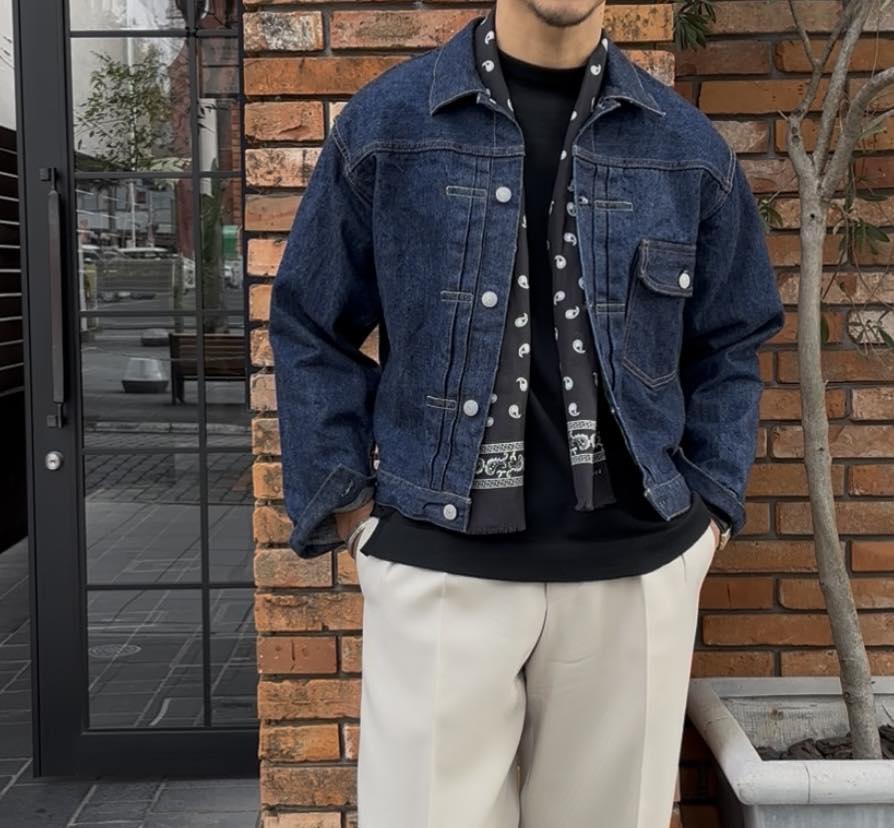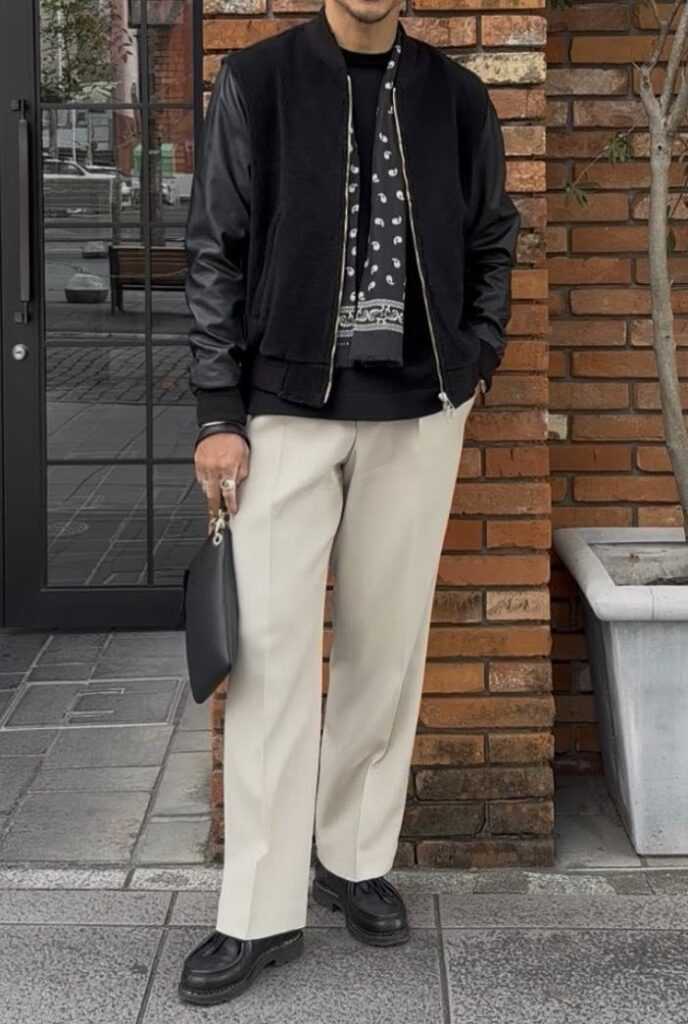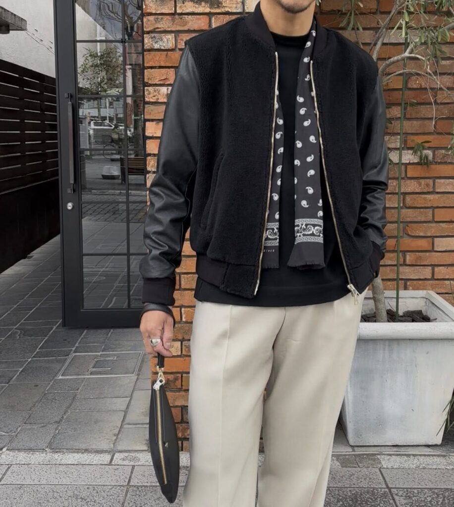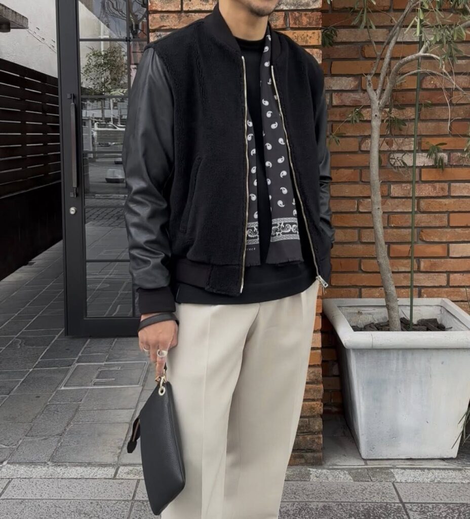 首から垂らしているのは、Bleckのストール。こちらのアイテムはコットン、リネン、シルクの素材でできているため春夏に適した物となります。今の時期でしたら、首元にはチャック柄のマフラーなどでも良さそうですね。少し春を意識した事を前提に、このストールを合わせています。