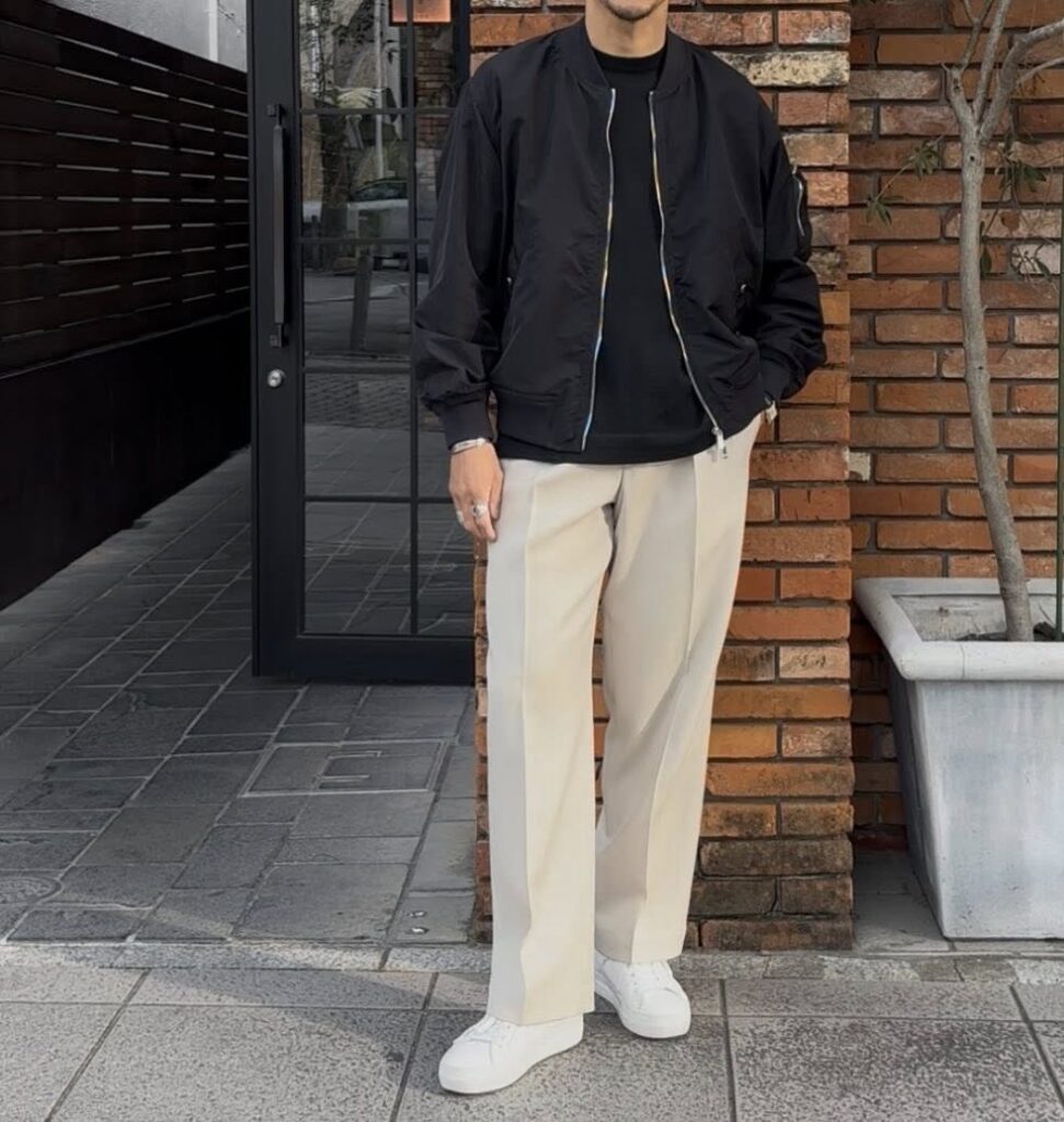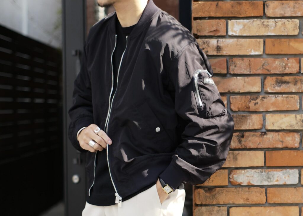 カジュアルなアイテムを大人な雰囲気で着る時のポイントで、上品なアイテムと組み合わせるか、色数を抑える。これさえ守れば、大人な雰囲気で、MA-1ブルゾンを着こなすことができます。