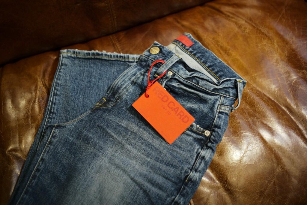 RED CARDの足長効果のある大人のデニム「Bass(バス)」股上を少し長めに取り、ウエスト/ヒップ周りはジャストに設計。裾が広がって見えないようにワタリから裾にかけて緩やかにテーパードをかけました。素材は綿100%の見え方で、デニムらしいラフ感ある=シボ感強めのストレッチデニムを採用。糸の打ち込み本数を多くして密度を上げることで無骨で硬めのデニム生地に仕上げています。経糸に3種類のムラ糸を組み合わせているため、加工後に自然とランダムなあたり感が出てきます。着用写真は改めて。