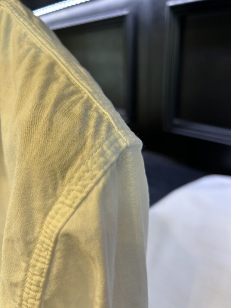 オリジナルの薄手の4.5oz シャンブレー生地 がモチモチでとってもいい感じです。3本針ステッチや随所に縫われているチェーンステッチでパッカリング(生地がうねる状態)になり体に馴染んできたら更に良くなりそうな予感。