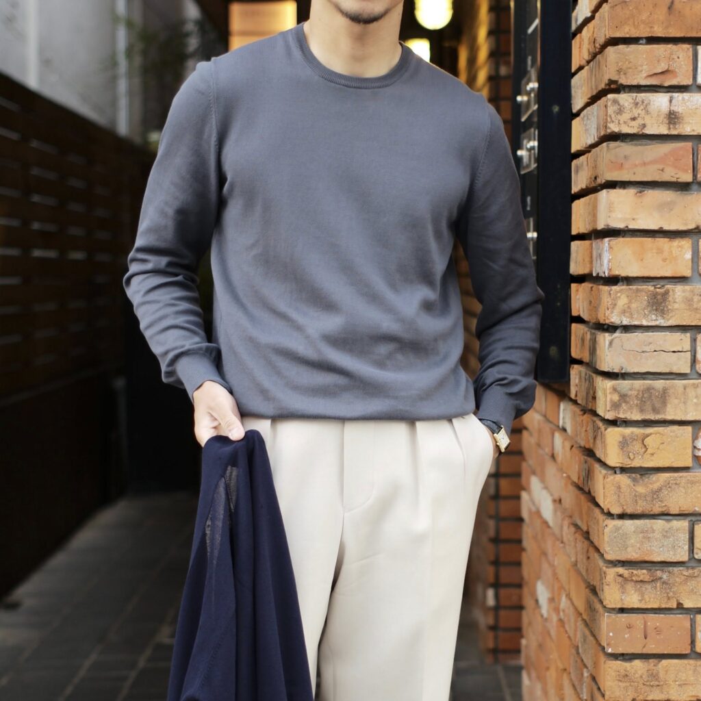 全体を3色までにして、着慣れた色の組み合わせをベースに春らしい軽快さをどう足すかを意識すれば、装いは洗練されるはず。今回は、ライトベージュのパンツで春らしさをプラス。また、インナーのスチールグレーは、意外と新鮮で、コーディネートがしやすくおすすめのカラーの一つ。