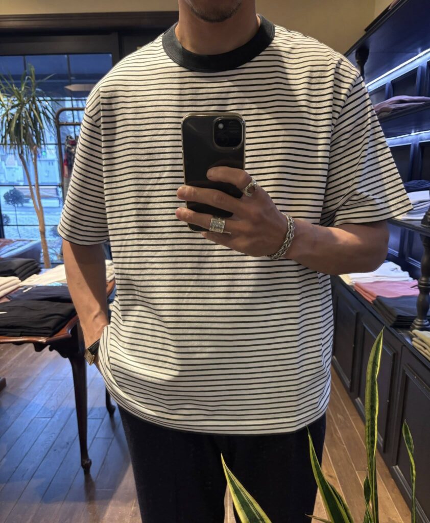 そんなオーシバルから、細いピッチのボーダーTシャツが届きました。素材は、コットンに、ポリウレタンを少し使うことでドライな質感と着心地の良さをプラス。こちらのオーシバルは日本製となり、プライスもお求めやすくなっています。
