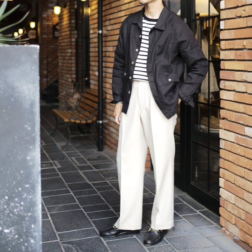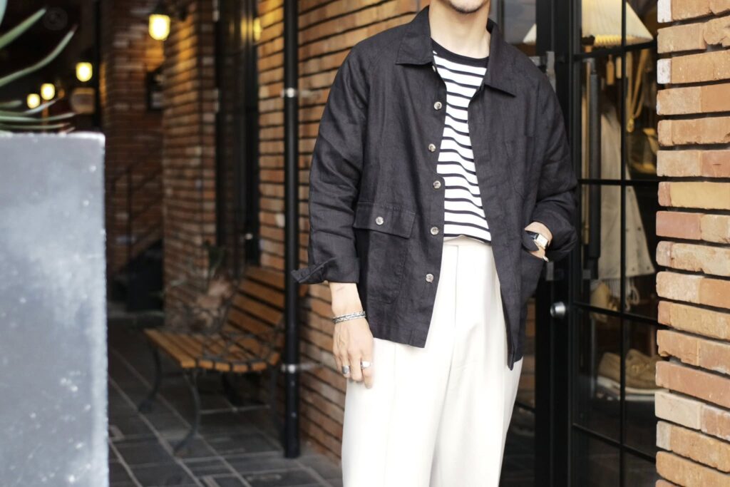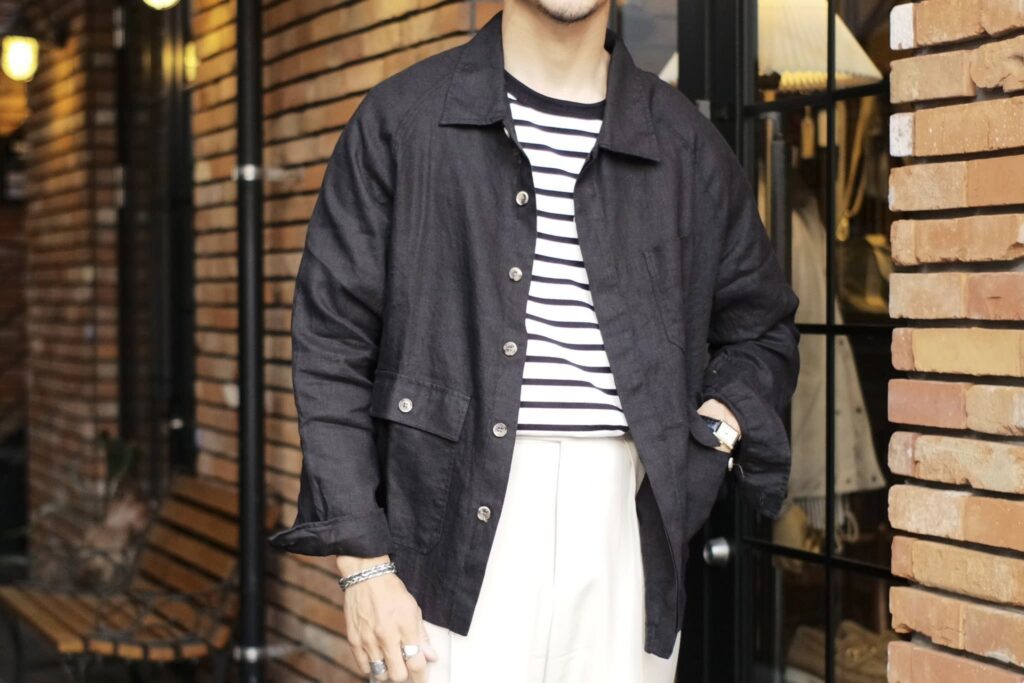 半袖のボーダーに、入荷したばかりのORIAN(オリアン)のカバーオールタイプのリネンジャケットを。