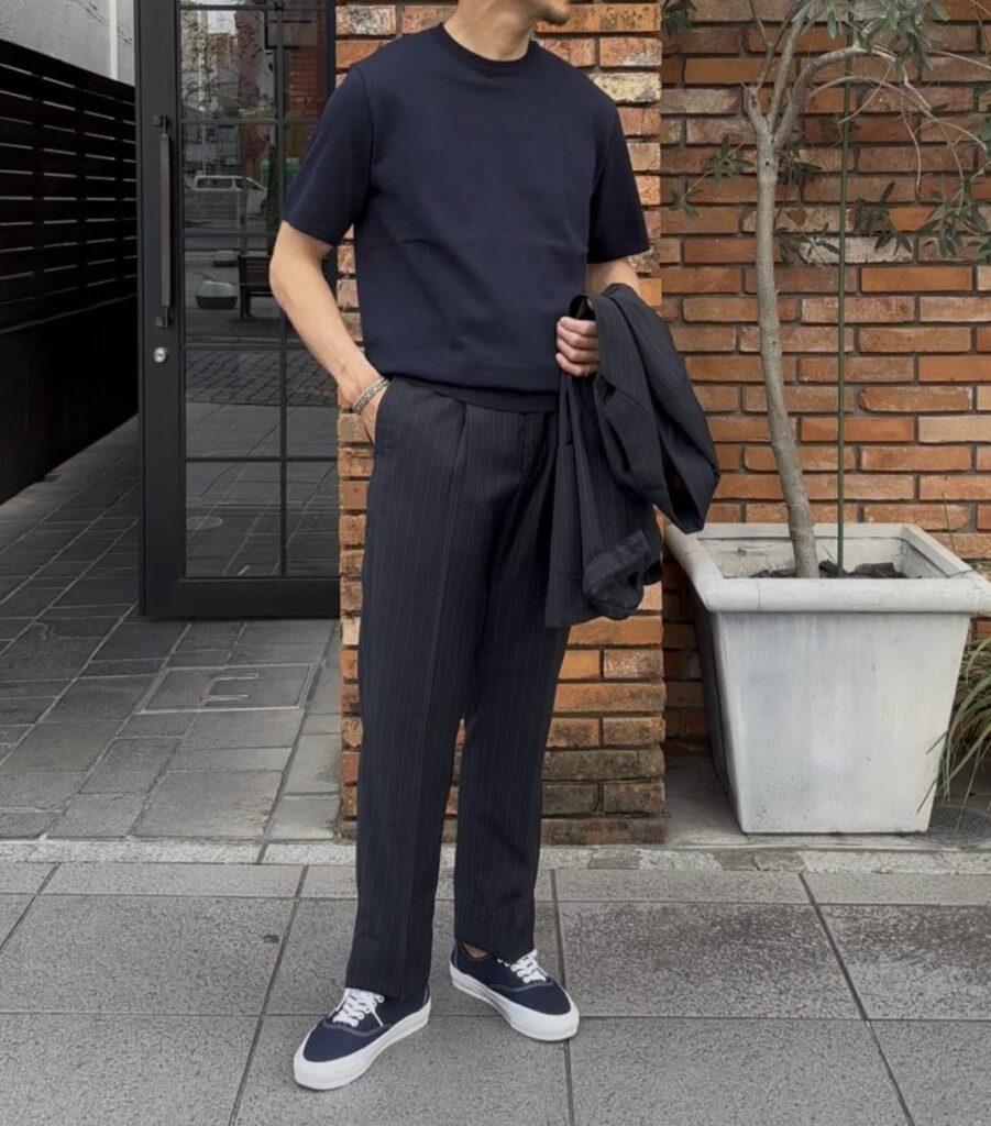 コーディネートに使った、Vandori(ヴァンドリ)のドレスTもドライタッチな肌触りと、上品な佇まいが毎年ご好評いただいています。今季のカラーは、ダークネイビーで大人な雰囲気です。