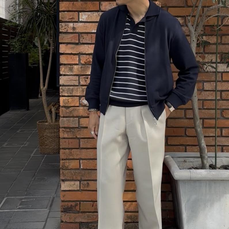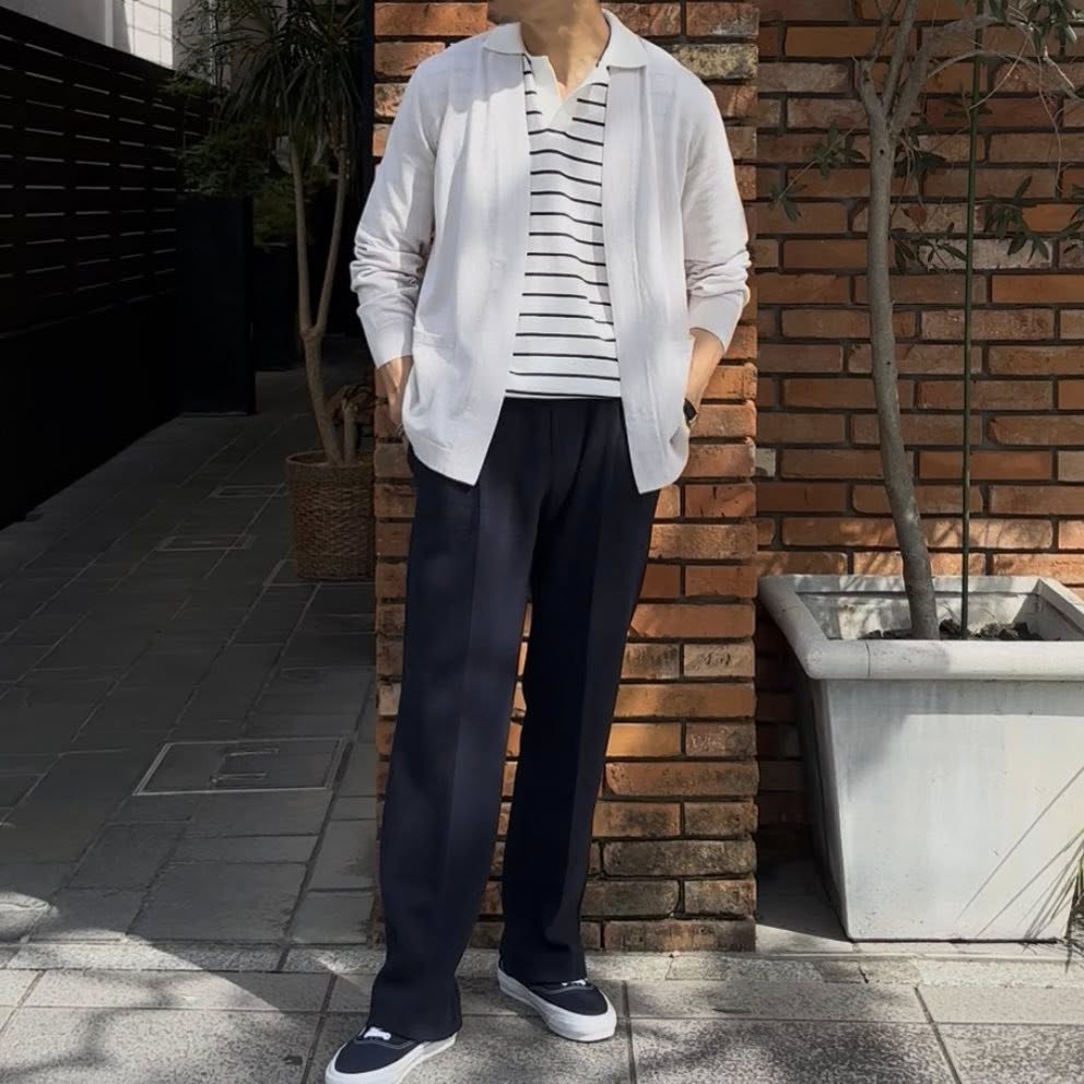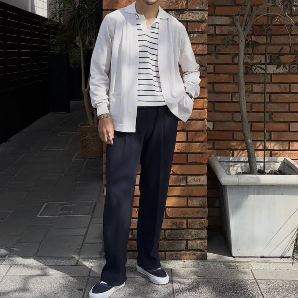 コットン100%の強撚糸を使用し、コンパクトスピンで精紡されたクリアな表情が特徴のボーダースキッパー。通常の約2倍の撚りをかけた強撚仕様により、Vandoriらしく、さらりとしたドライな肌触りと接触冷感性を備え、これからの季節に適した軽やかな着心地に仕上がっています。原料には豪州産の長綿を使用し、シャリ感のある風合いと上質な見え方を両立。デザインは浅めに設定したVネックのスキッパー仕様で、開きすぎないバランスが上品さと自然な抜け感を演出します。ボディはフラットな天竺編みの12ゲージで透けにくく、襟から前立てにかけてはミラノリブでしっかりとした印象に。袖口と裾口はリブ編みで全体を引き締めています。ベーシックなフォルムにボーダー柄を掛け合わせることで、シーズンらしい軽快さと程よい遊び心を加えた一枚。単体での着用はもちろん、セットアップや軽い羽織りのインナーとしても取り入れやすく、幅広いスタイリングに対応します。